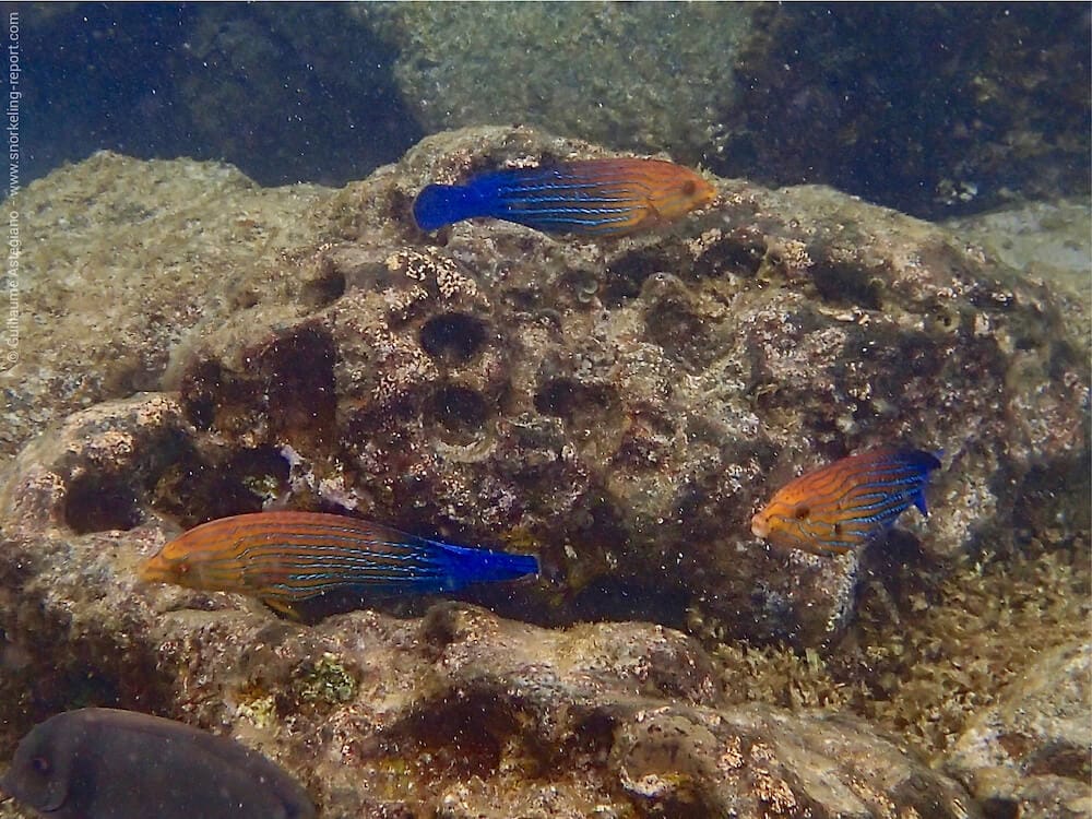 We can easily observe near the edge, schools of hundreds of whitebar surgeonfish, several species of colorful wrasses (the yellow-brown wrasse, the blue-striped orange tamarin), as well as some more tropical fish, such as the yellow-longnose butterflyfish.