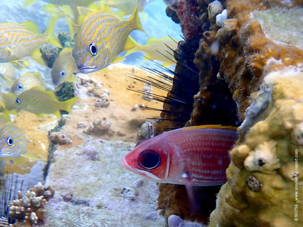 La zone qui se trouve en face du Aquarium Restaurant, connue sous le nom d’Aquarium Beach, est particulièrement intéressante. La plage de sable descend en pente douce avant de laisser place à des affleurements coralliens et rocheux où l’on rencontre de beaux spécimens de corail corne d’élan, des gorgones et des bancs de poissons-chirurgiens. Essayez aussi d’y repérer les nombreuses murènes qui vivent dans les cavités du platier.