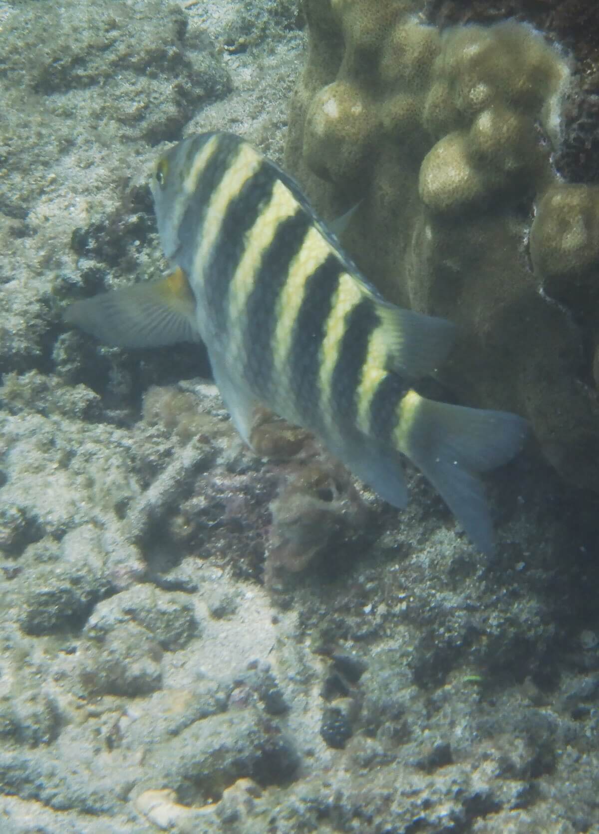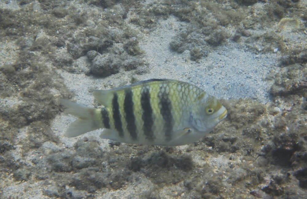 Parfois confondu avec Abudefduf sordidus, qui a un point noir à la base supérieure de la nageoire caudale.