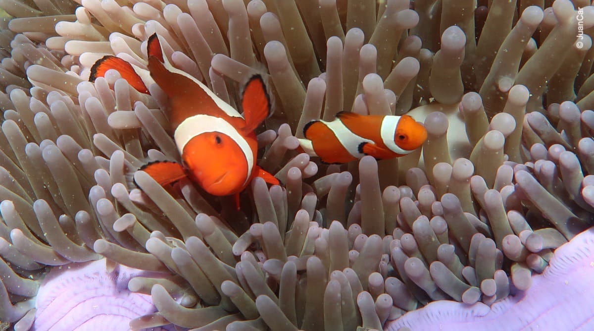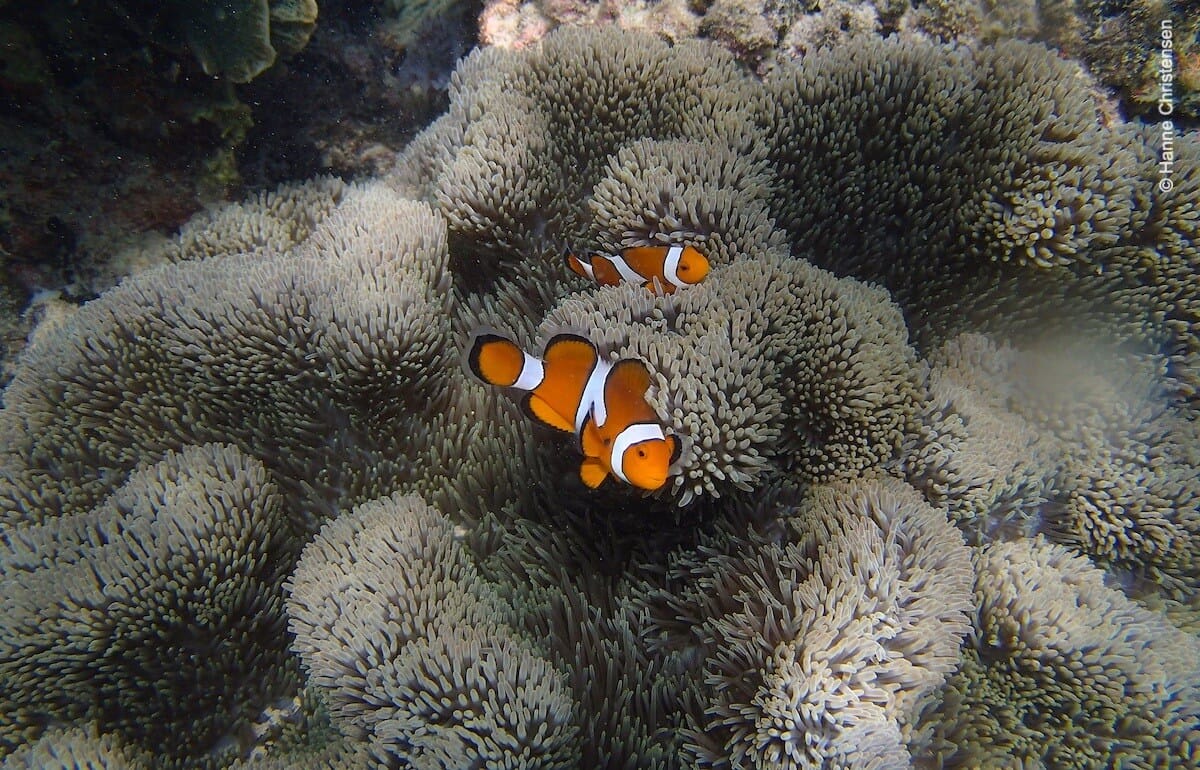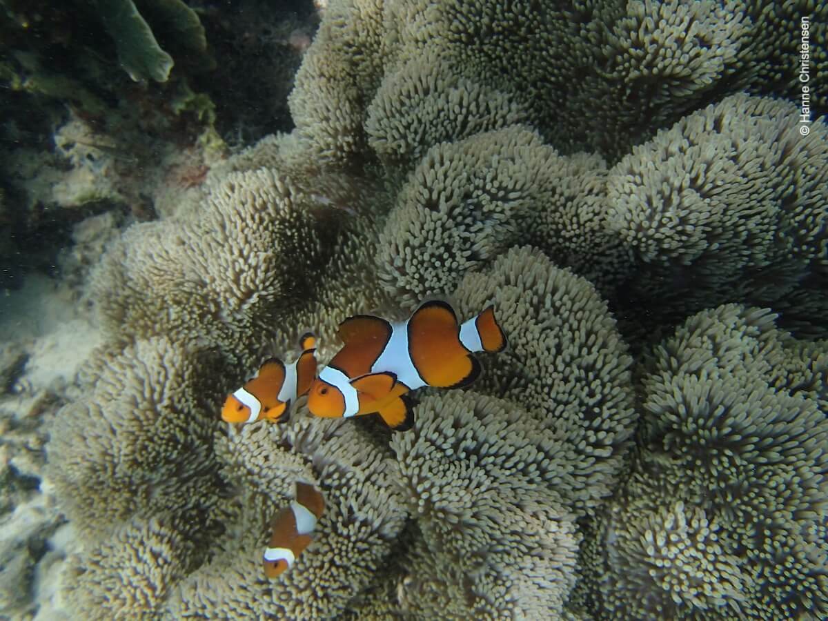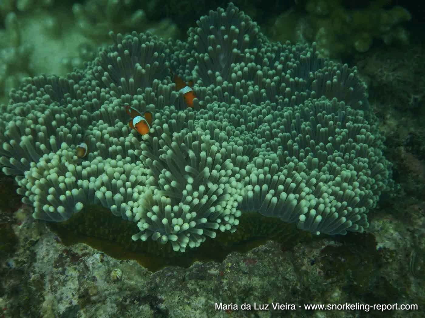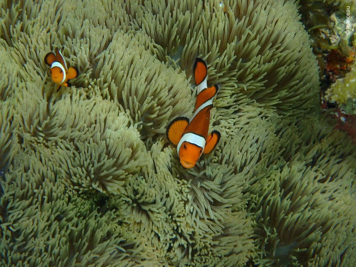 Vit en association avec trois espèces d’anémones: Heteractis magnifica, Stichodactyla gigantea et Stichodactyla mertensii.