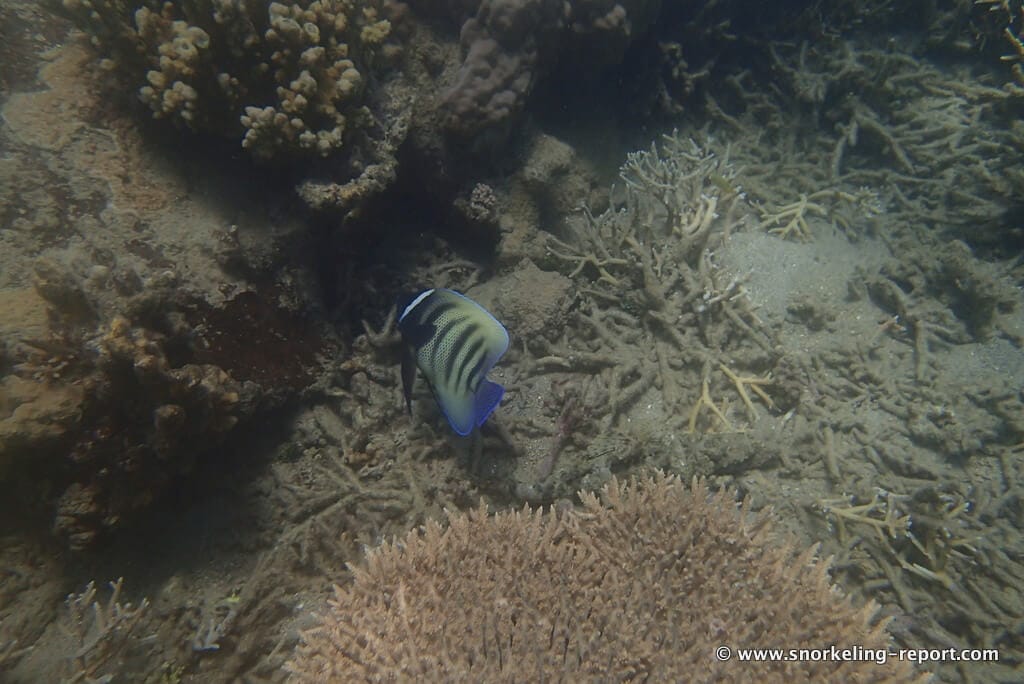 Comme la plupart des espèces de poissons-anges, Pomacanthus sexstriatus connaît un changement radical d’aspect lors de sa croissance, les juvéniles ayant des motifs et couleurs très différents de ceux des adultes.