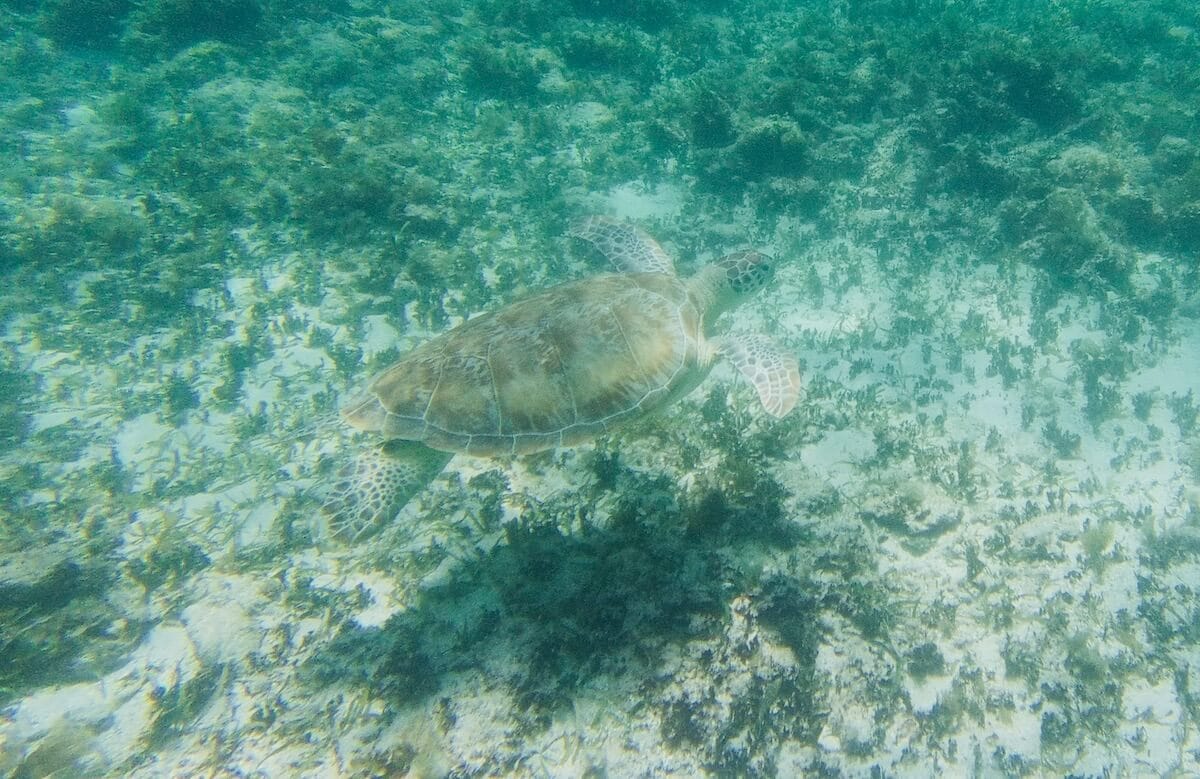 Dans cette zone, la profondeur est peu importante (↕1-3m). Les tortues que l’on rencontre ici sont des tortues vertes, qui viennent se nourrir et se reposer sur les herbiers. Ne les touchez pas et laissez-leur assez d’espace lorsqu’elles remontent à la surface pour respirer.