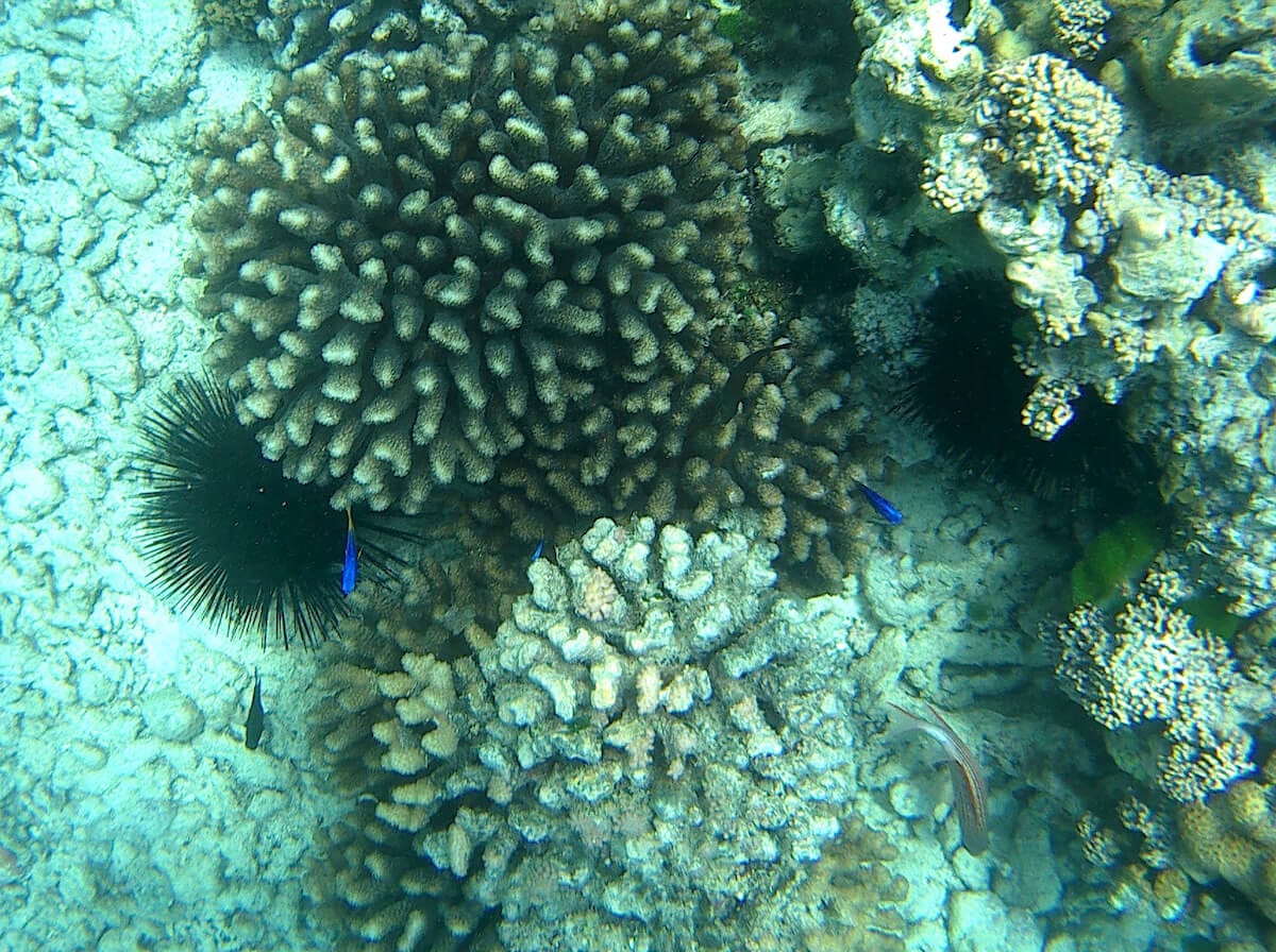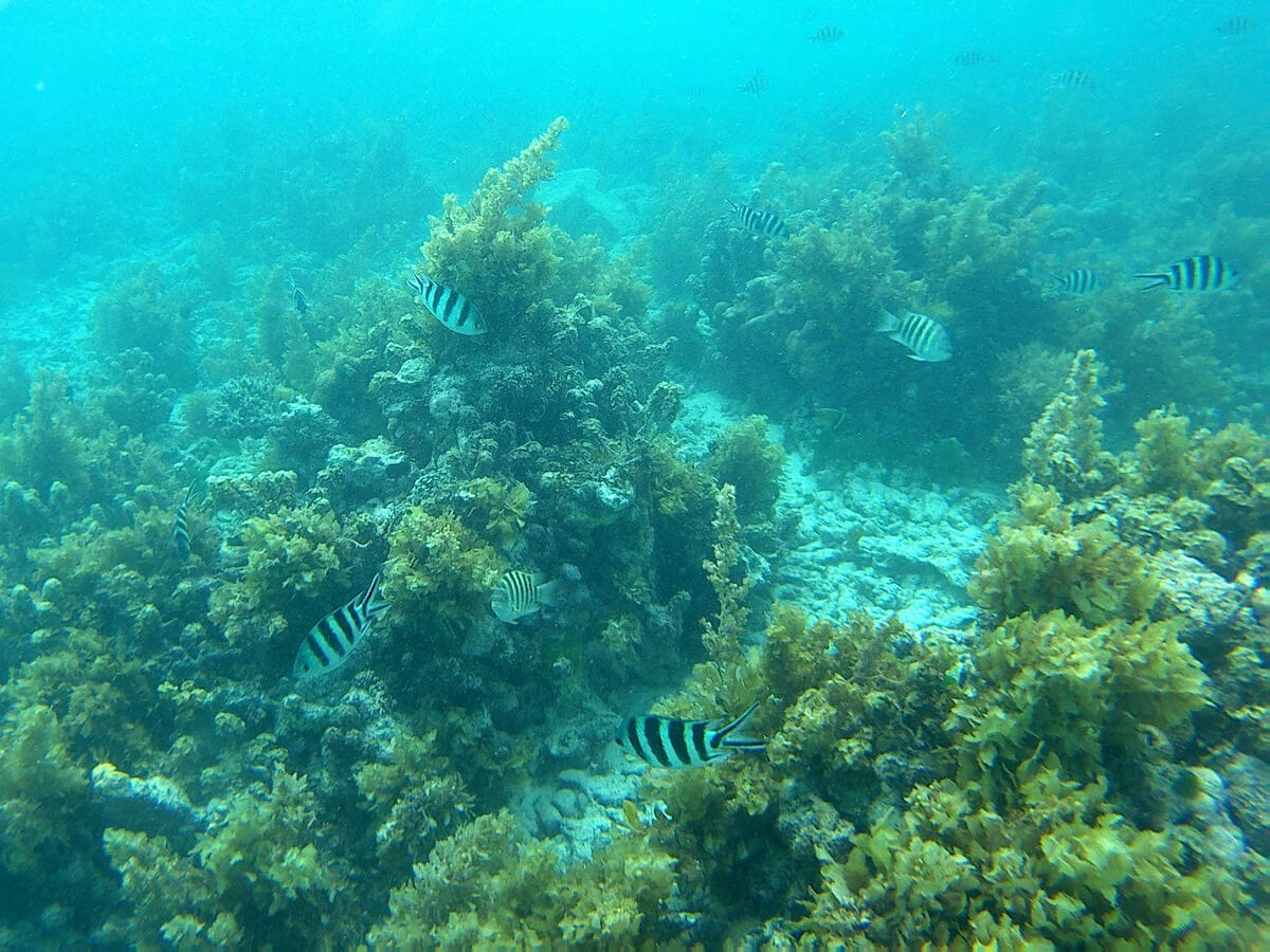Les formations récifales alternent avec des zones de sable et des zones d’algues, rendant le paysage sous-marin varié et atypique. Frayez-vous un chemin entre les patates de corail qui affleurent sous la surface. Parmi les coraux durs identifiés sur ce spot figurent les Pocillopora, les Acropora, du corail favia, du corail cerveau et occasionnellement des Echinopora.
