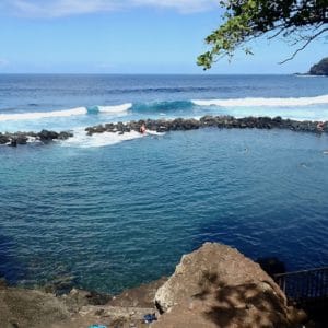 Des escaliers en pierre permettent de se mettre à l’eau facilement. Attention à ne pas glisser sur les dernières marches. Ne vous mettez pas à l’eau si il y a des vagues dans le bassin.
