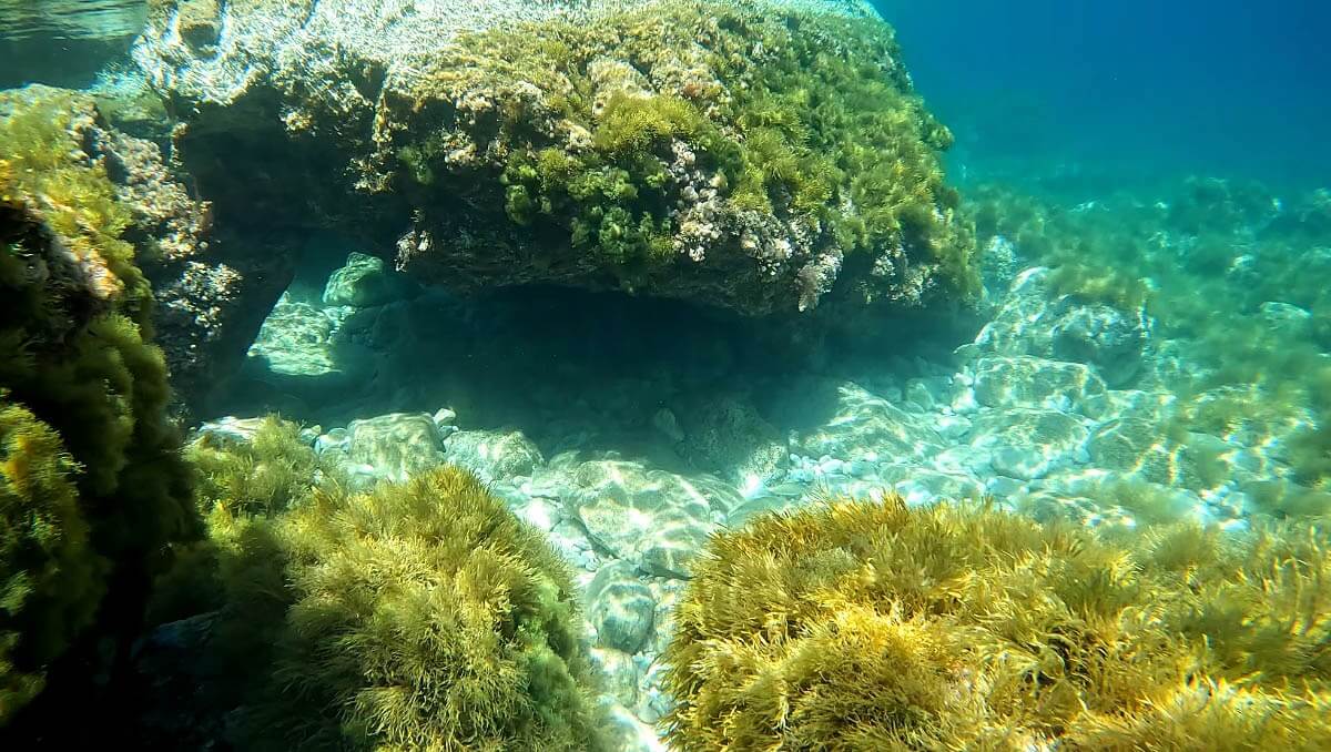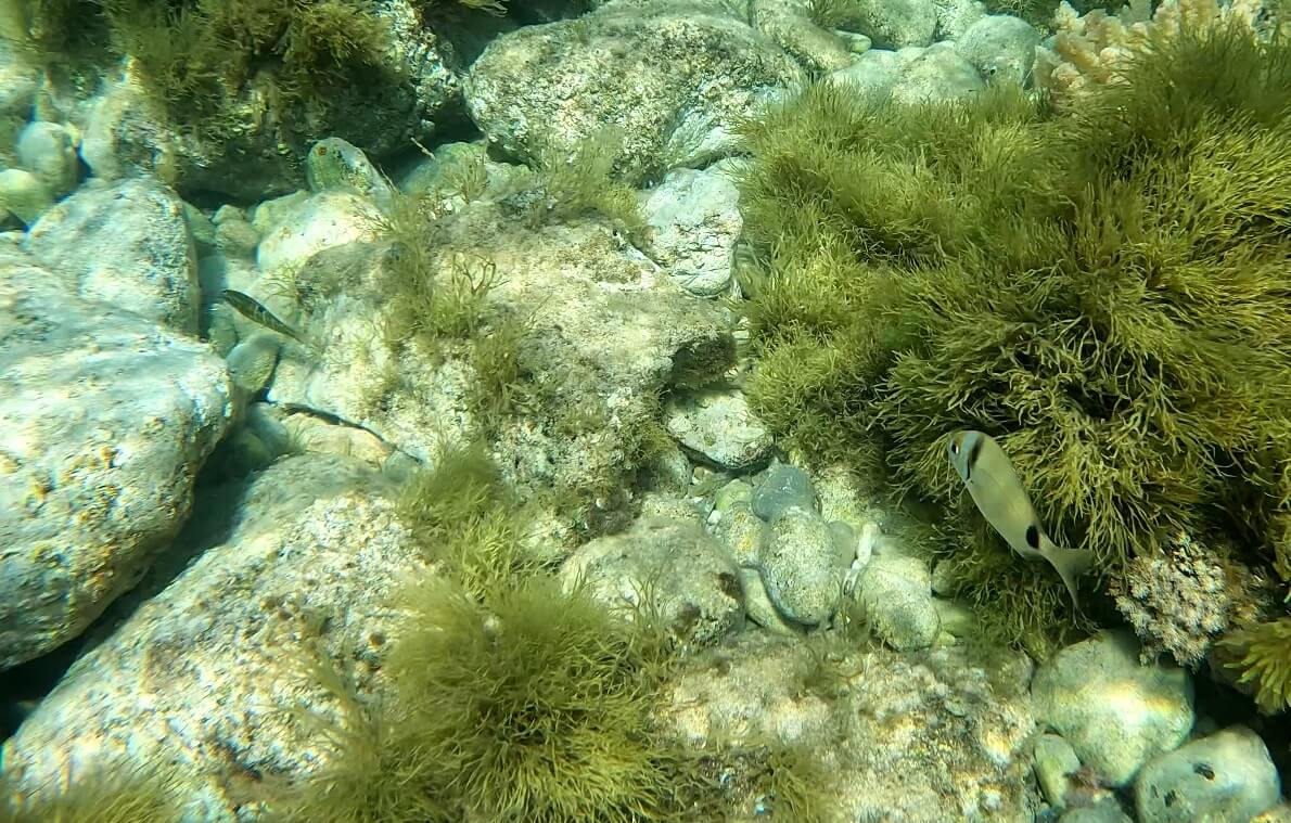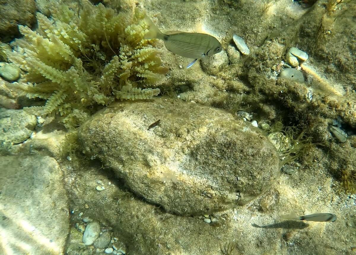 Différentes espèces de poissons vivent à Cala Berretta: des sars à tête noire, des sars communs, des oblades (probablement l’espèce la plus commune sur ce spot), ou encore des girelles paon, très colorées.