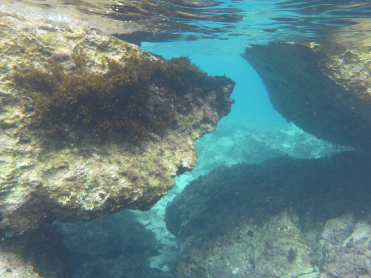 Près du bord, les fonds sont sableux, mais en palmant un peu (à environ 70m de la plage) on peut rejoindre des zones rocheuses. On peut aussi longer les petites falaises qui bordent la crique.