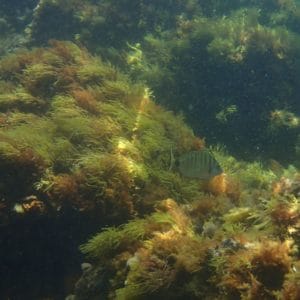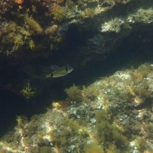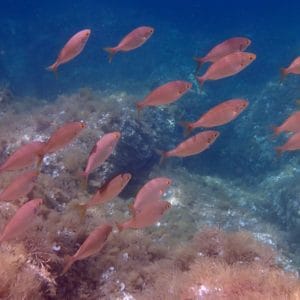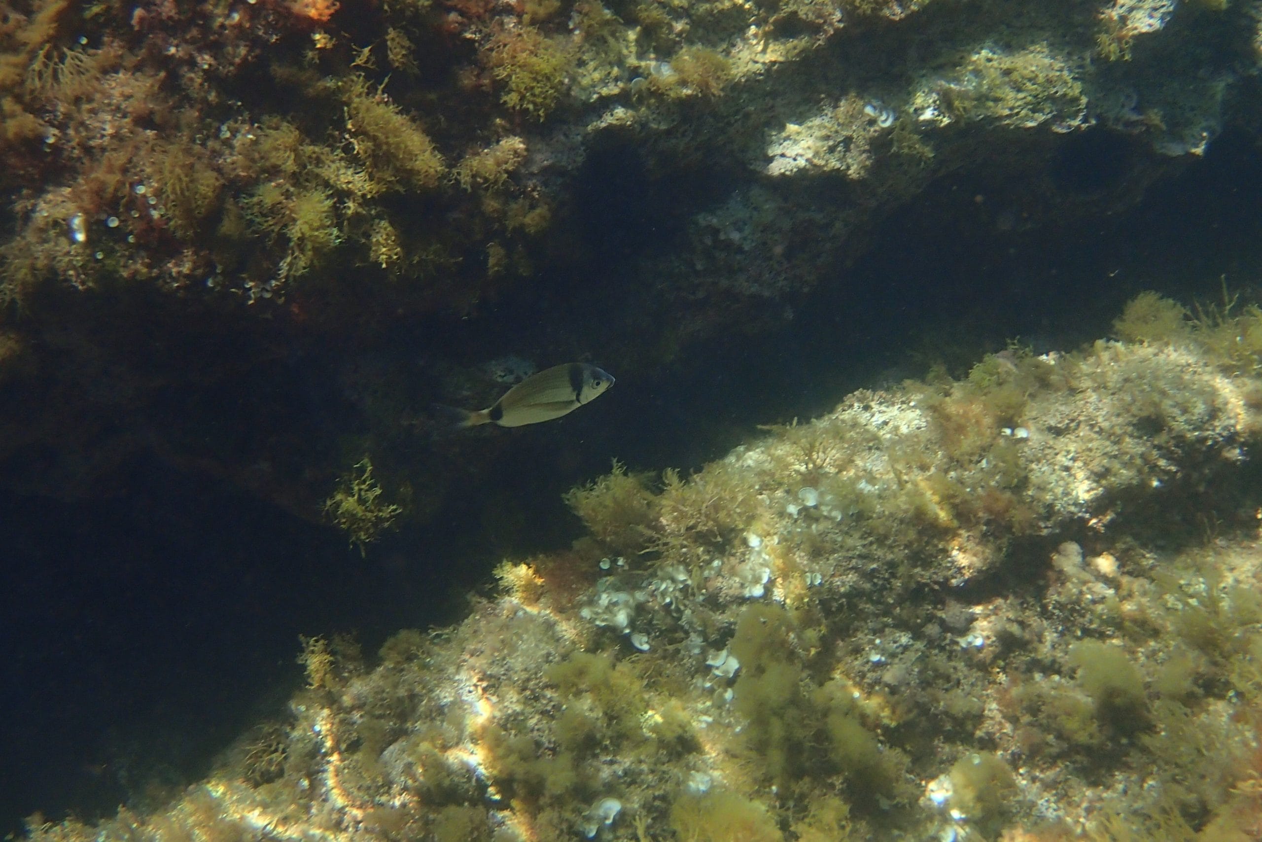 Ce spot n’est pas situé dans une réserve marine et l’on y voit peu de gros poissons. Les espèces les plus communes ici sont les saupes de Méditerranée, les sars à tête noire et les mulets. Près des rochers, vous verrez sûrement aussi des serrans écriture et des castagnoles. Sur les fonds, cherchez aussi les jolies étoiles de mer rouges qui sont assez communes sur ce spot. Avec un peu de chance, vous pourriez aussi croiser la route d’une petite dorade ou observer un crénilabre-paon en train de se faire nettoyer par un labre.