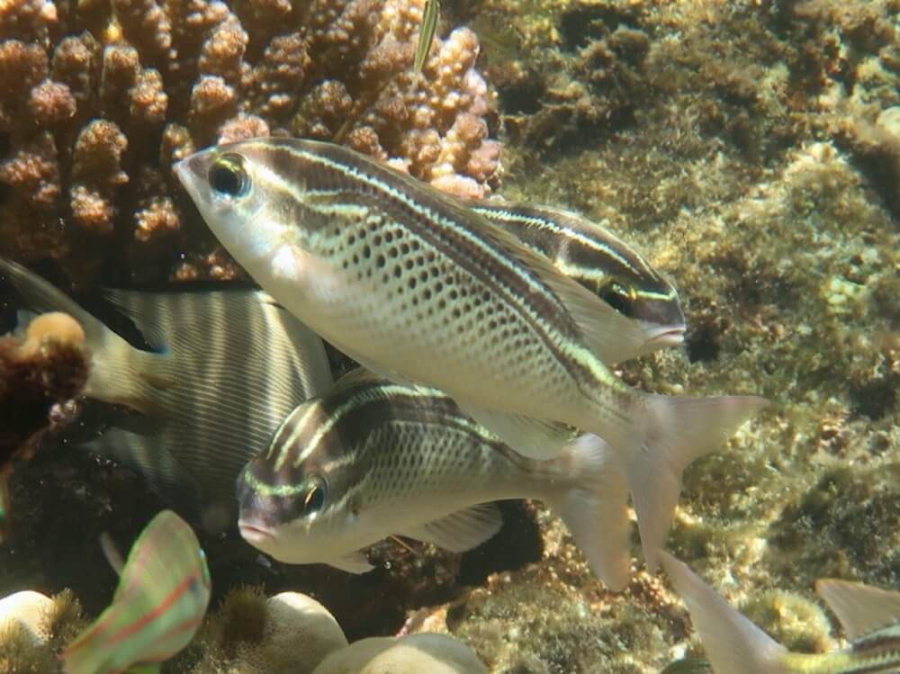 Rejoignez ensuite les patates de corail, que l’on distingue bien depuis la plage. Même si elles sont assez petites, elles présentent une concentration de vie sous-marine incluant des coraux durs et mous, des anémones de mer et de nombreux poissons. Il est par exemple facile d’y voir des poissons-clowns à deux bandes, des anthias, plusieurs espèces de poissons-chirurgiens, des balistes et des poissons-perroquets.