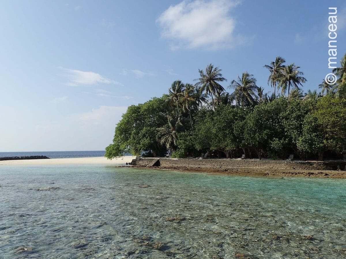 L’île d’Embudu est bordée de récifs et de tombants aux profils variés. La hauteur d’eau varie de 1 à 2m sur les platiers à plus de 10m au pied des tombants, parfois vertigineux.