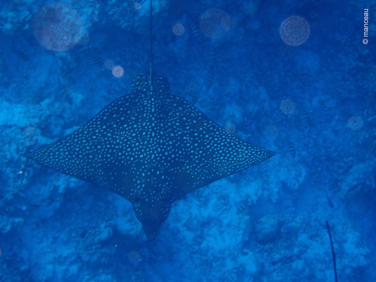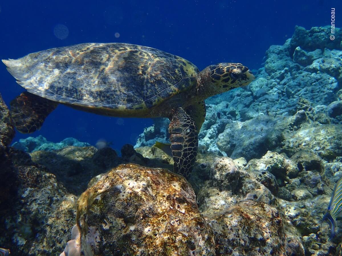Embudu est aussi l’occasion d’observer dans le bleu ou sur le récif des espèces plus impressionnantes, comme des groupes de raies léopard, des requins à pointes noires, ou encore des tortues imbriquées.