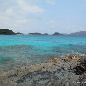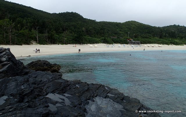 La plage de Furuzamami est étendue, mais seule sa bordure ouest (à gauche lorsque vous regardez la mer) abrite une zone récifale. Marchez donc en cette direction, jusqu’à la pointe de rochers noirs qui ferme la plage.