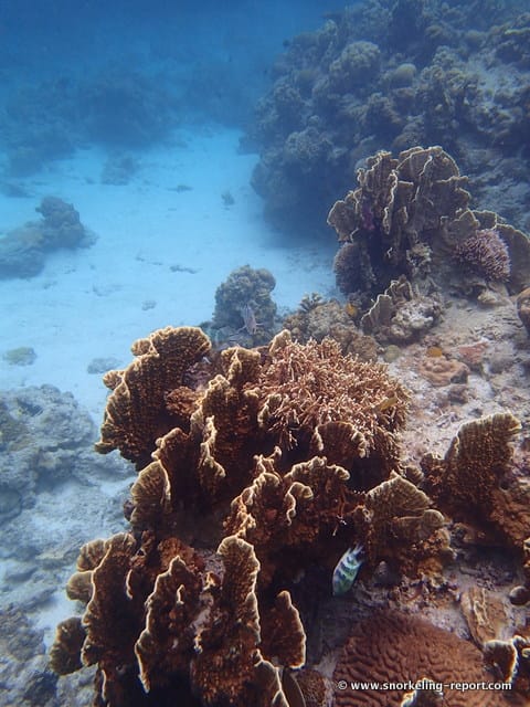 A marée haute, on peut explorer le récif principal (zone 2), assez petit, qui borde l’extrémité ouest de la plage. Parcourez-la à votre guise. Les différents récifs sont couverts de coraux de bonne qualité, qui tombent sur des fonds sableux peu profonds (env. 4m).