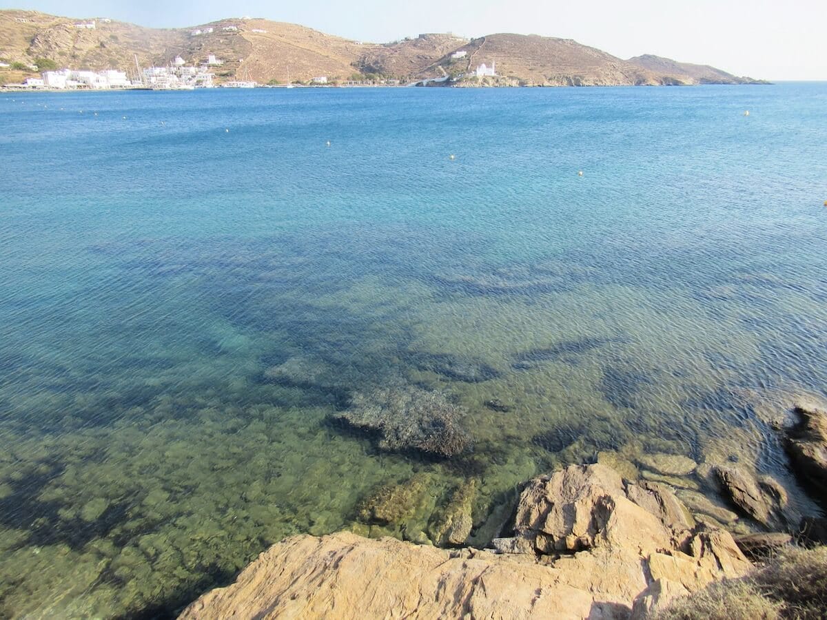 Restez bien de ce côté de la baie et à distance du port, autour duquel il y a de nombreux mouvements de ferries et autres bateaux. L’autre extrémité de la baie, au pied de l’église Sainte-Irène (Agia Irini) n’est pas non plus adaptée au snorkeling en raison de rejets d’eau usée.