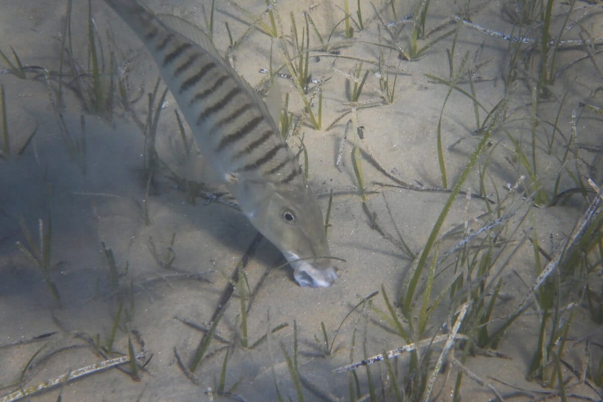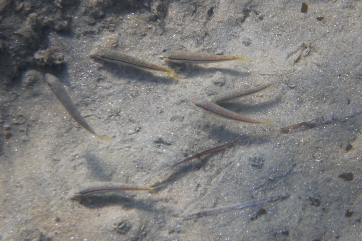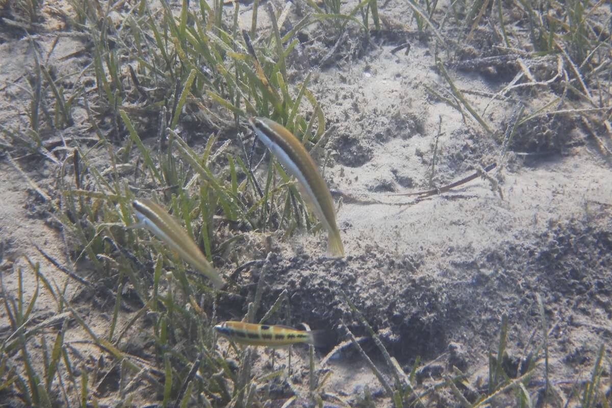 Les fonds sableux et herbiers épars sont aussi visités par des marbrés et des rougets, qui fouillent dans le sable à la recherche de nourriture. On peut aussi y remarquer des étoiles de mer peigne plus ou moins couvertes de sable.