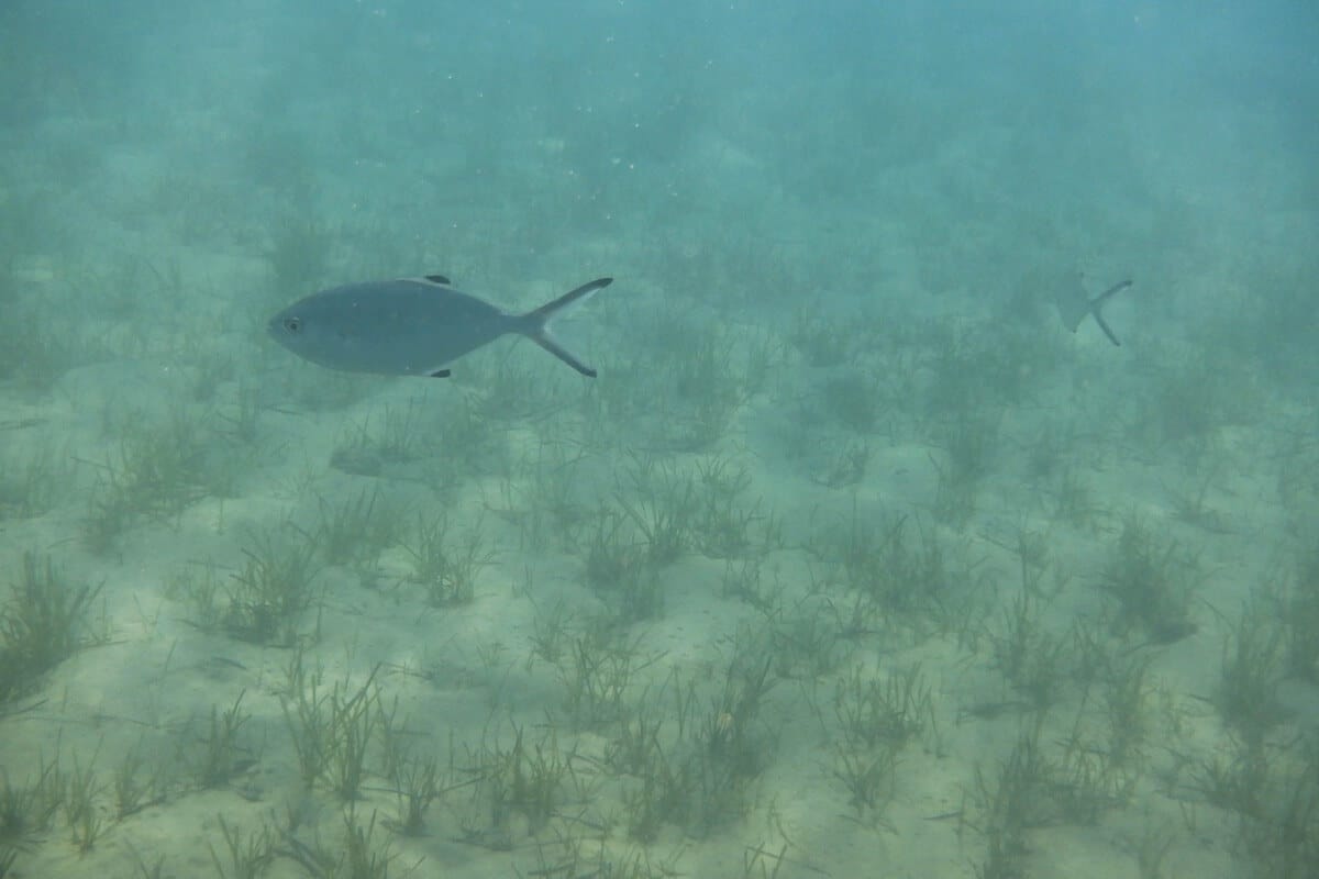 Au-dessus des herbiers, des palomines (aussi appelées liches glauques ou liche étoilées) nagent en pleine eau. Cette espèce, appartenant a la famille des carangues, apprécie les eaux chaudes de la Mer Égée.