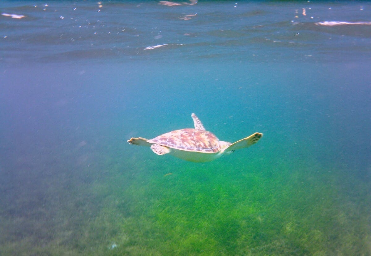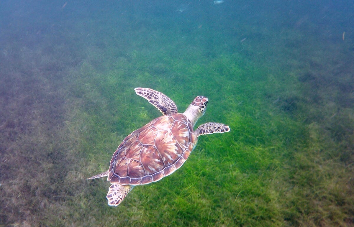 Alors que les bords de la baie sont rocheux, le centre de celle-ci est couvert d’herbiers étendus, où la profondeur oscille entre 2 et 5m. Ce sont précisément ces zones d’herbiers qui attirent à Grande Baie de nombreuses tortues vertes.