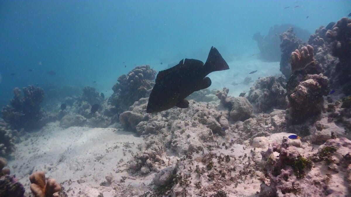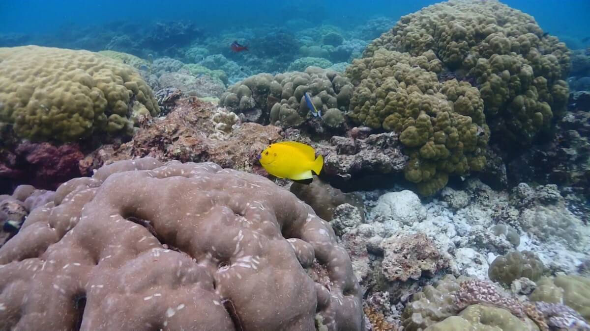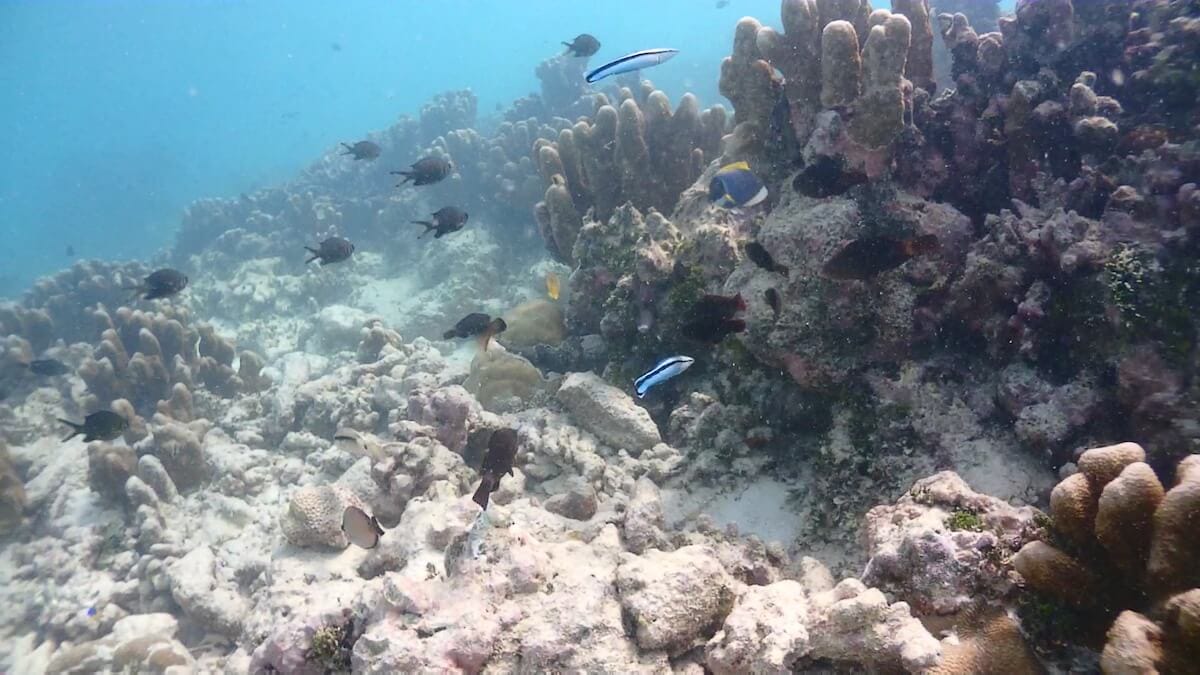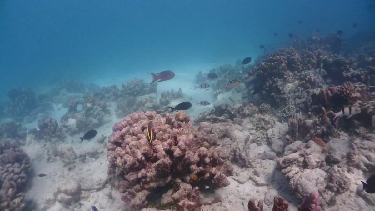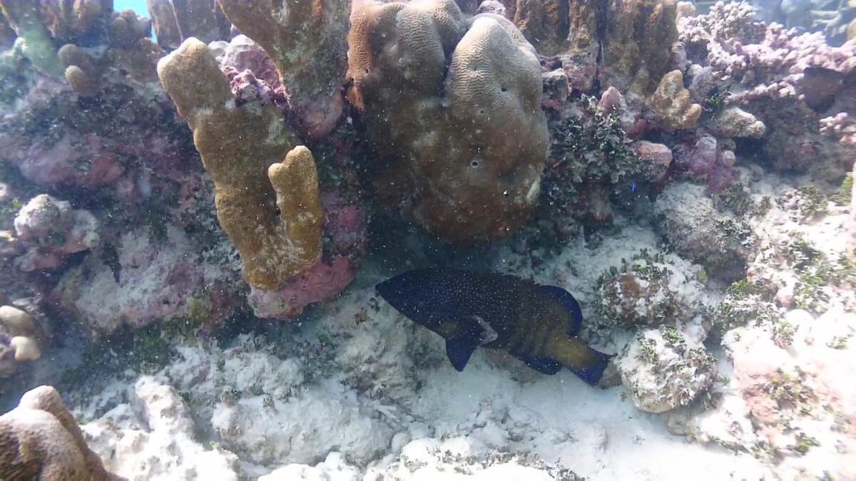 Sur ce spot, les coraux sont dans un état moyen en raison de récents épisodes de blanchissement. On trouve quand même de nombreuses patates en bonne santé, principalement de corail massif poreux et de corail digité.