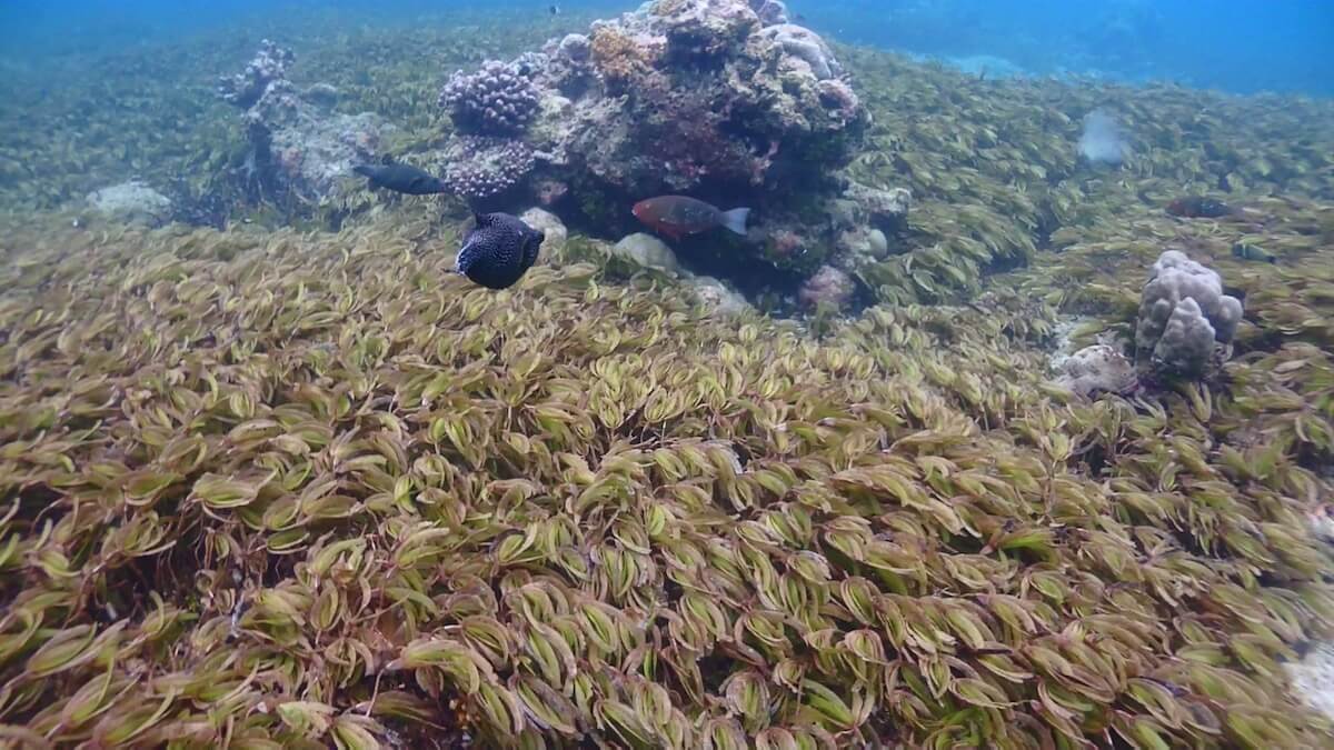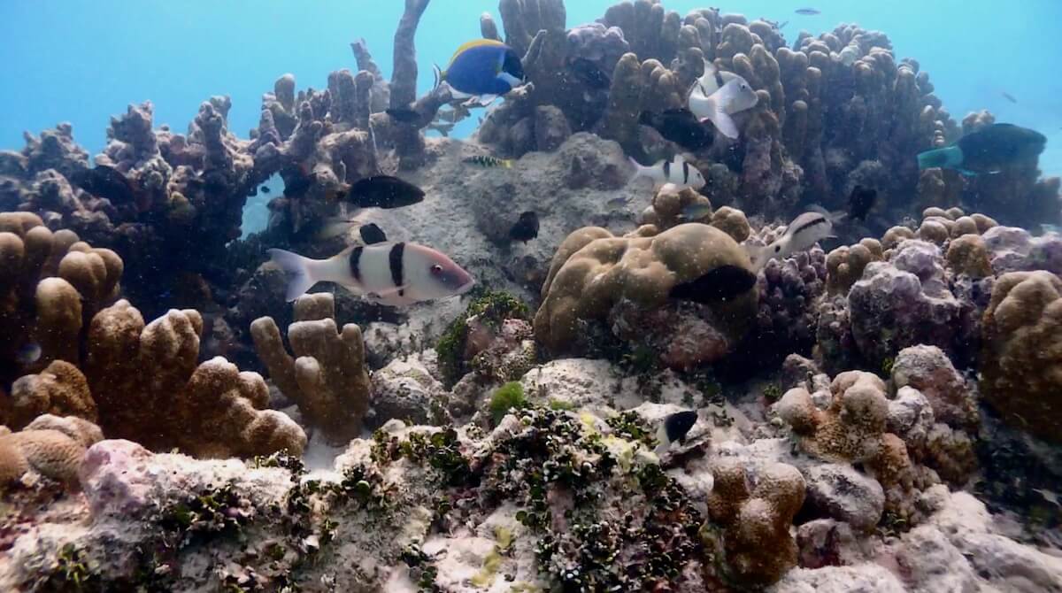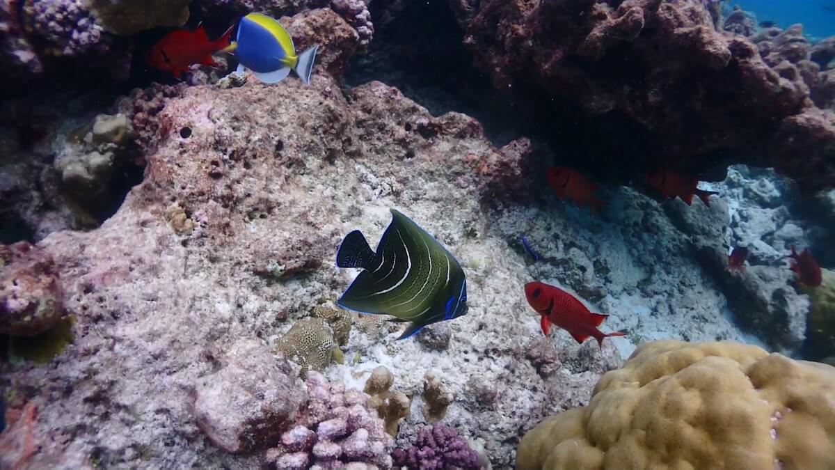Parmi les poissons les plus communs ici figurent les poissons-papillons (plusieurs espèces – voir liste complète des espèces observées en bas de page), les poissons-ballons, les poissons-chirurgiens (notamment le joli chirurgien à poitrine blanche) et les poissons-anges. Des fusiliers forment de larges bancs au-dessus des herbiers, tandis que des gaterins géants et des mérous stationnement près du récif.