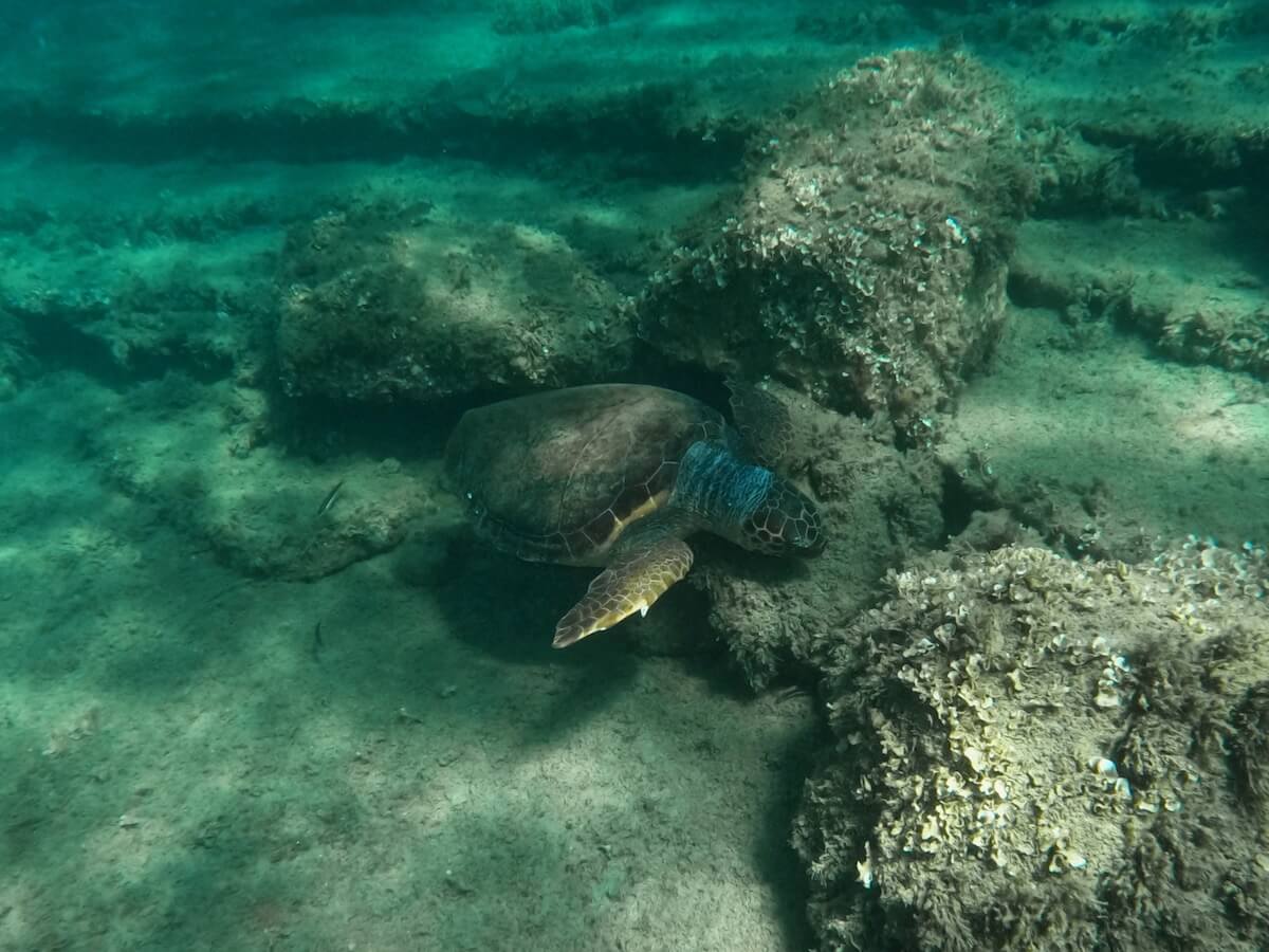 La zone recommandée pour l’observation des tortues est composée de fonds rocheux et sableux, de profondeur moyenne (2 à 4m). Pour trouver les tortues, vous pouvez notamment repérer les autres snorkeleurs déjà dans l’eau, ou encore les petits bateaux d’excursions qui se rendent sur le site.