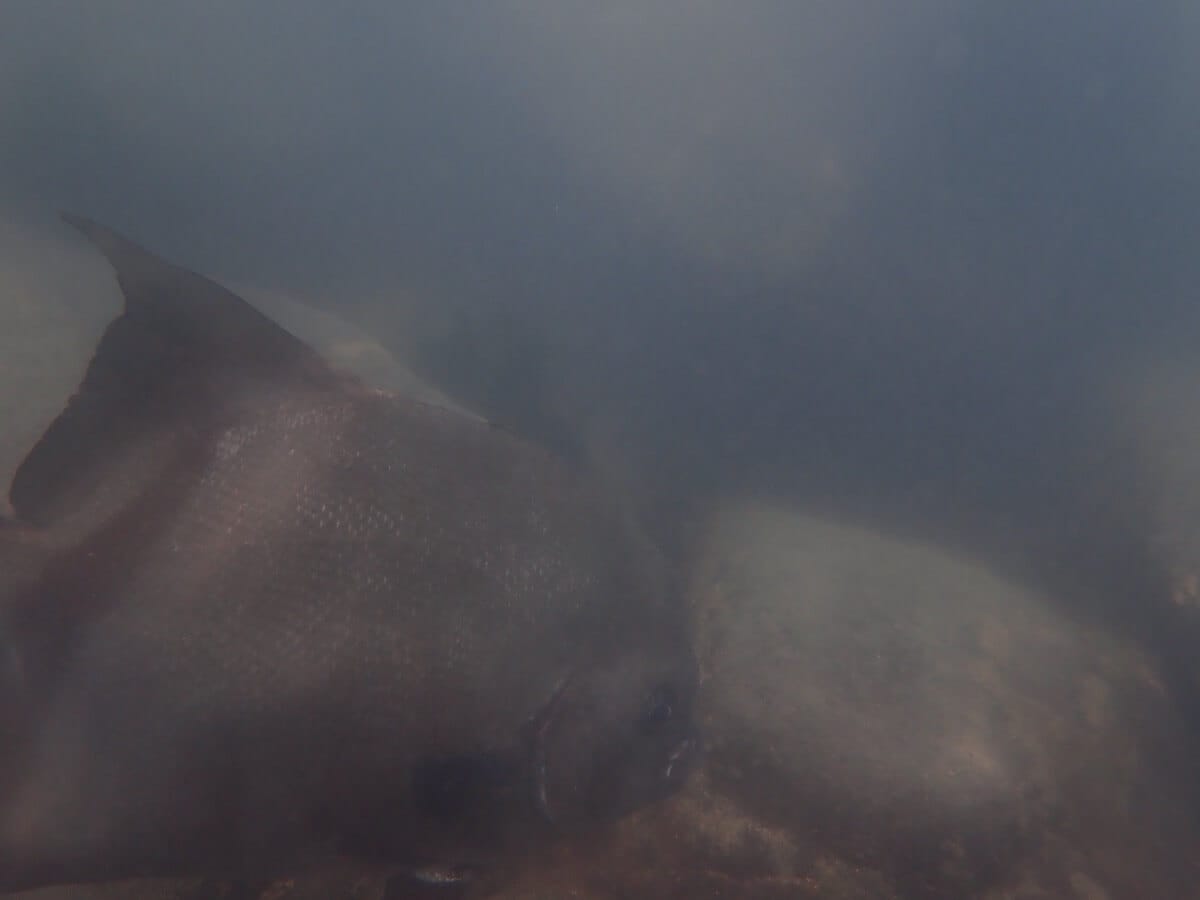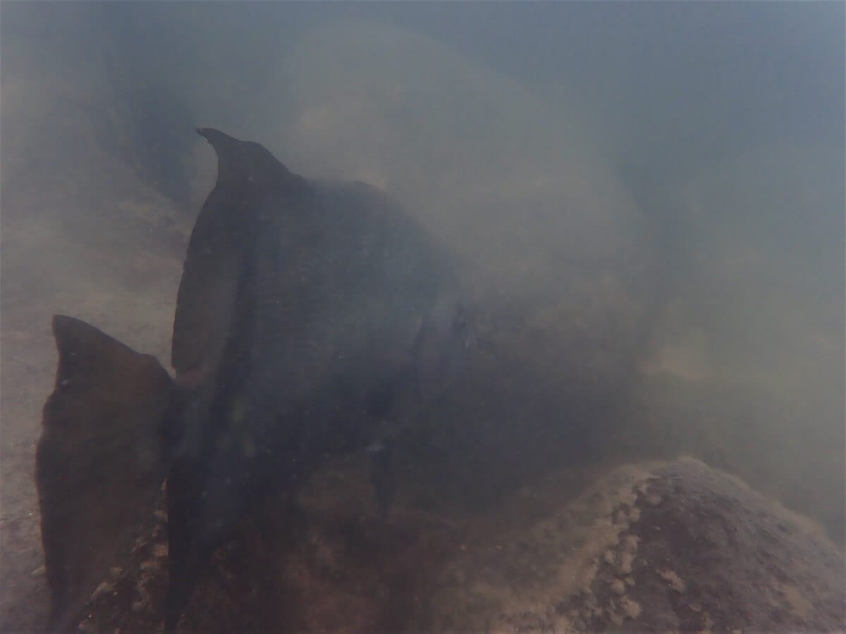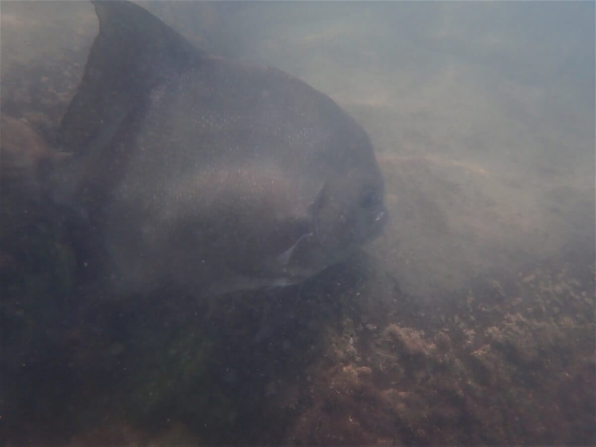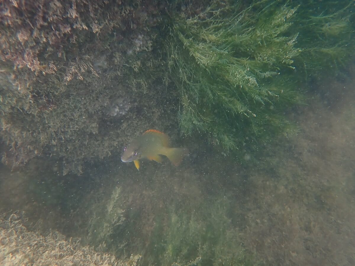 Les fonds de l’anse (zone 1 sur la carte) sont composés de gros blocs de rochers noirs, souvent couverts de petites algues. Malgré une température de l’eau idéale, vous noterez l’absence de coraux, qui ne peuvent se développer dans ces eaux chargées de sédiments.