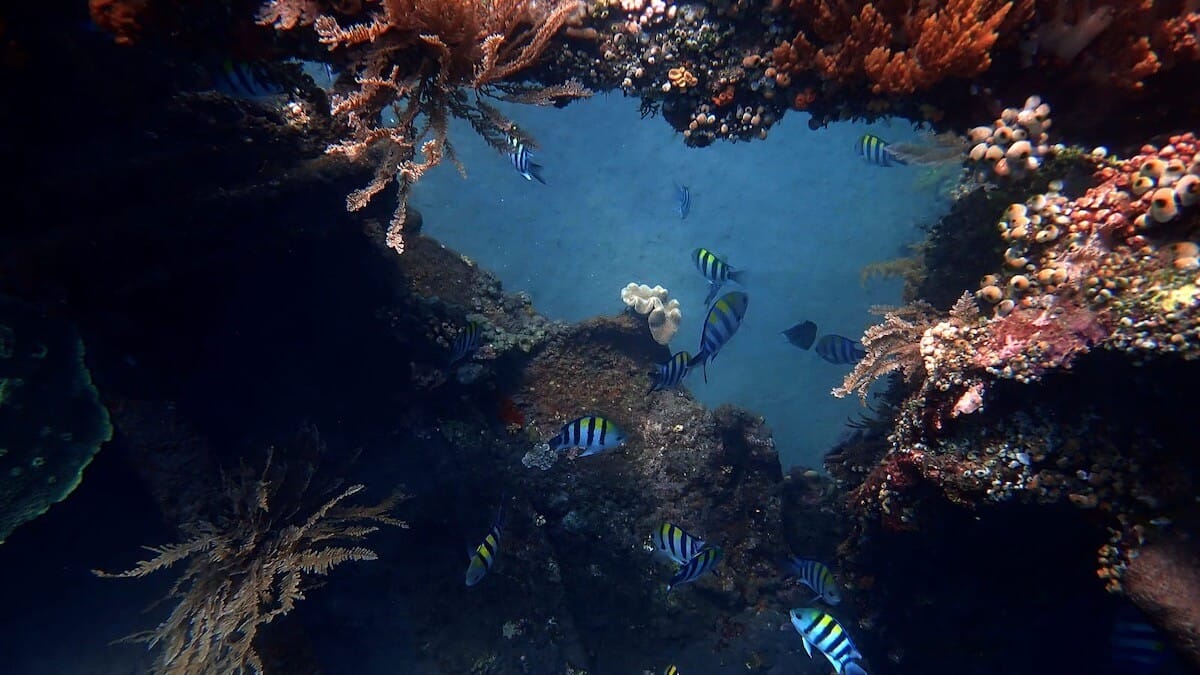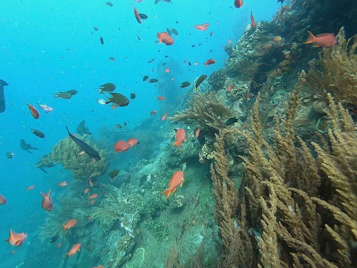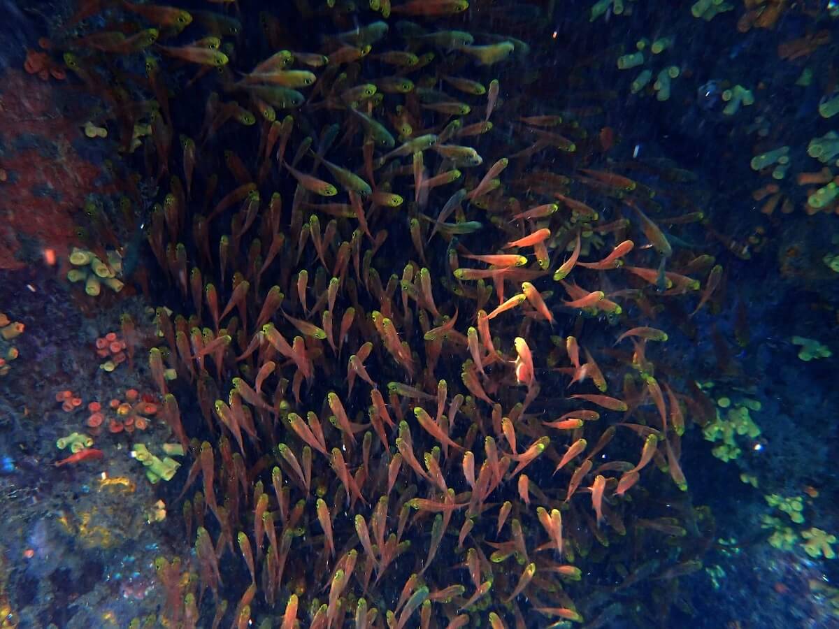 Ce milieu attire de nombreux poissons: des poissons-trompettes, des apogons, des cochers, des chirurgiens, des demoiselles, des papillons… En contrebas (↕4-6m), des centaines d’anthias, aux tons rouge et fuschia, gravitent le long des tombants.