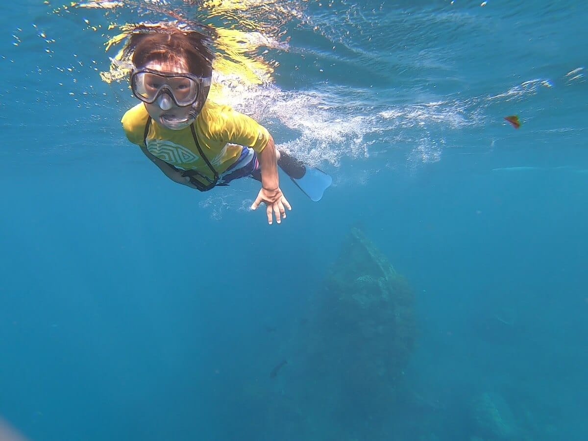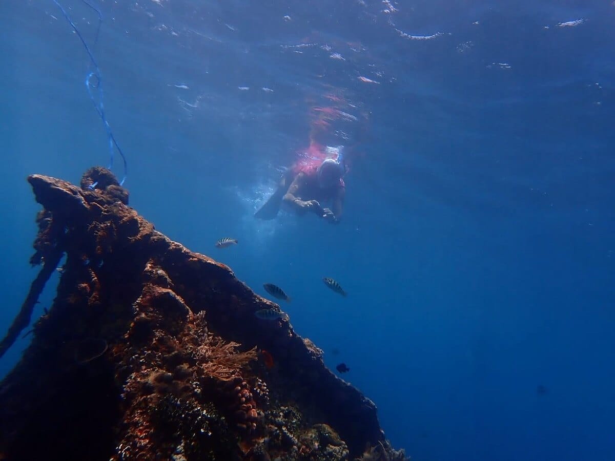 Le Japanese Wreck repose sur des fonds variant de 2 à 20 m, mais affleure en moyenne entre 1 et 6m de la surface. En snorkeling, vous profiterez surtout de ses parties les plus hautes. C’est autour de la proue, dont la base est surtout explorable en plongée bouteille, que l’on trouve la hauteur d’eau la plus importante.