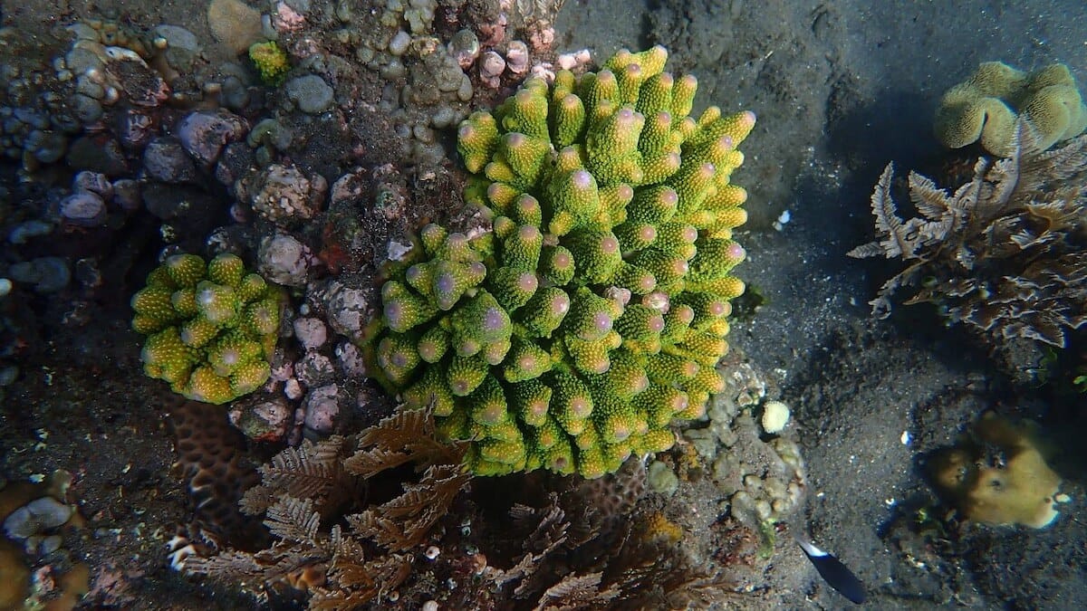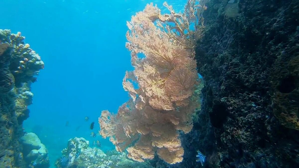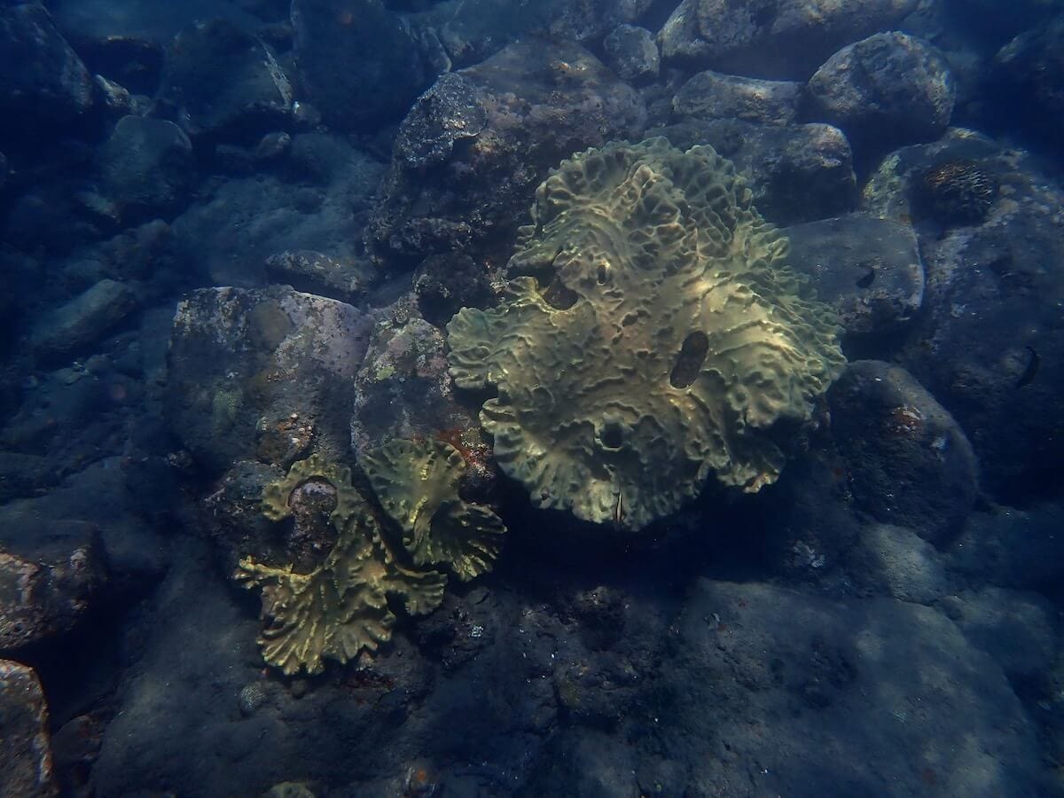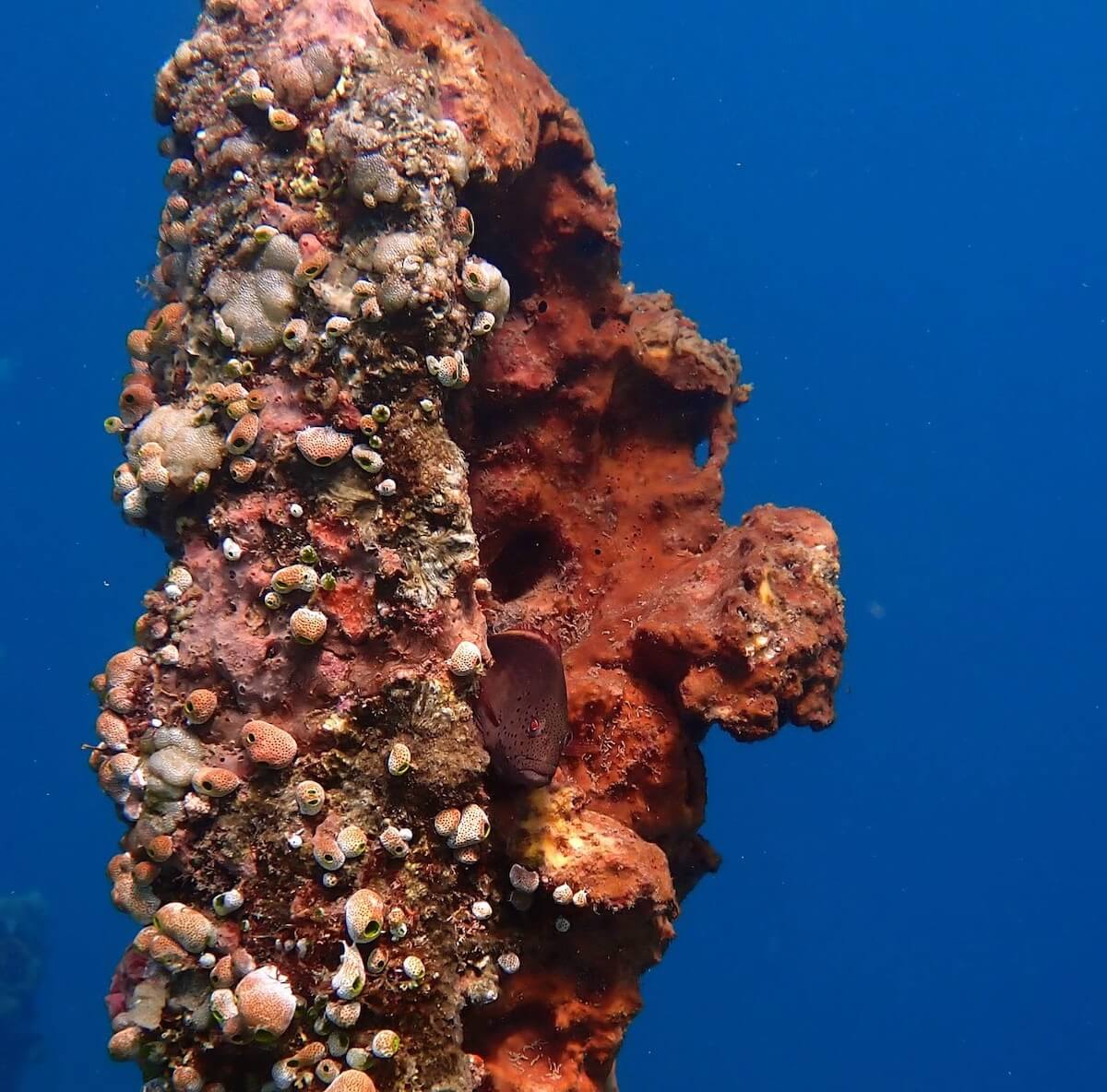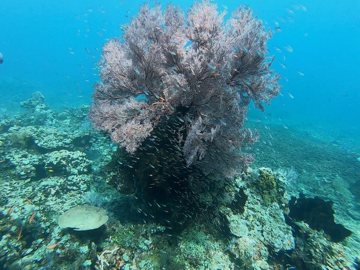 L’épave et ses environs ont été colonisés par quelques coraux durs (corail cerveau, corail digité), mais surtout par une belle variété de coraux mous, incluant des plumes de mer, des gorgones et de superbes Dendronephthya.