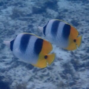 Parmi les autres espèces communes au Jardin de Corail figurent les labres-clowns (dont les juvéniles sont reconnaissables à leurs deux ocelles oranges), les poissons-ballons pintade, et les poissons-papillons d’Ulietea.