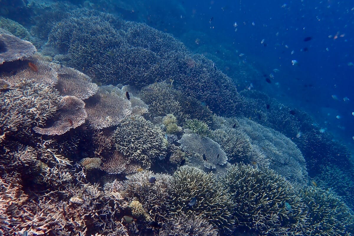 Au nord de la zone, on trouve de grands massifs de corail bleu (Heliopora sp.), qui prolifèrent entre les herbiers et le tombant récifal. Celui-ci, principalement composé de corail de type Acropora, tombe plus ou moins verticalement à des profondeurs supérieures à 10 m.