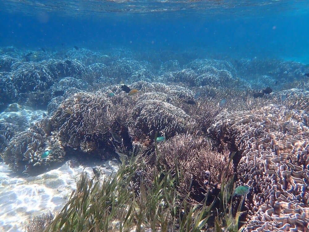 Les herbiers marins occupent une grande partie des zones peu profondes, en particulier au nord et au sud de la plage. Ils se fondent dans des zones mixtes d’herbiers, d’affleurements coralliens et de débris coralliens. Ces derniers sont plus étendus près du ponton.