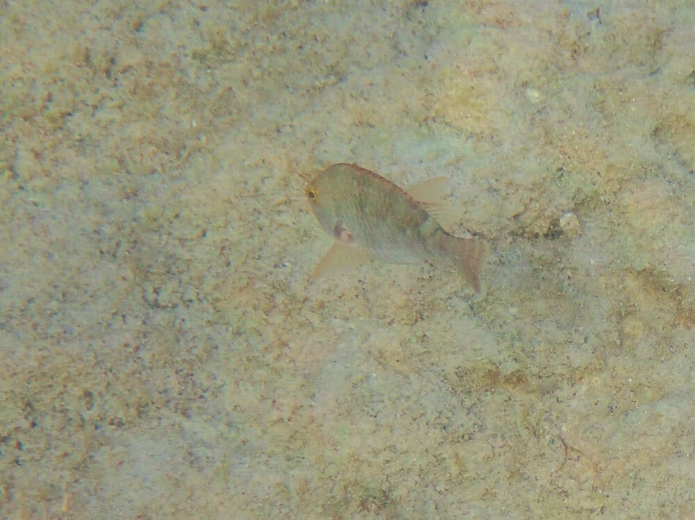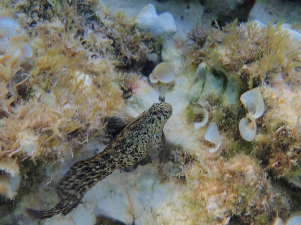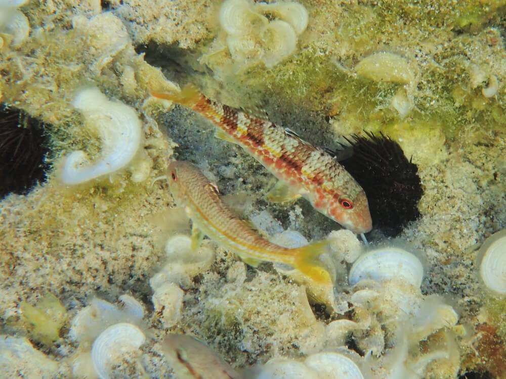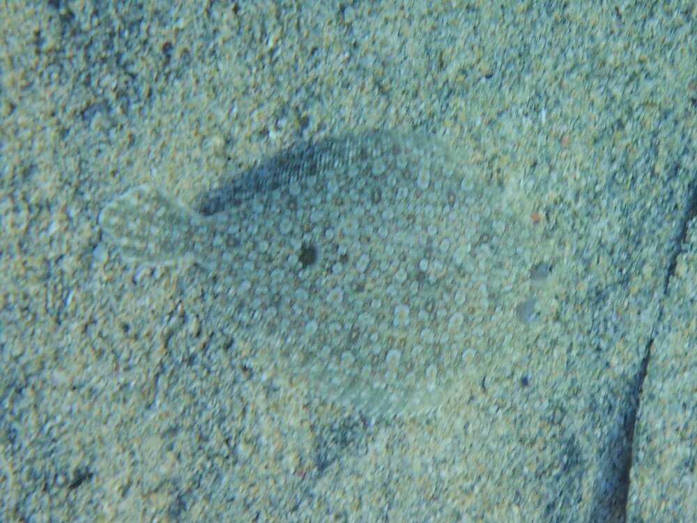 Les fonds sableux qui s’étendent au-delà des rochers sont quant à eux propices à l’observations d’espèces bien spécifiques: le rombou, particulièrement commun à partir de 8-10 m de fond (bien que parfois difficile à voir en raison de son camouflage) et le grondin volant, aux remarquables nageoires pectorales qui se déploient en éventail. Celui-ci n’hésite pas à venir plus près du bord et, assez territorial, on le retrouve souvent au même endroit d’un jour à l’autre.