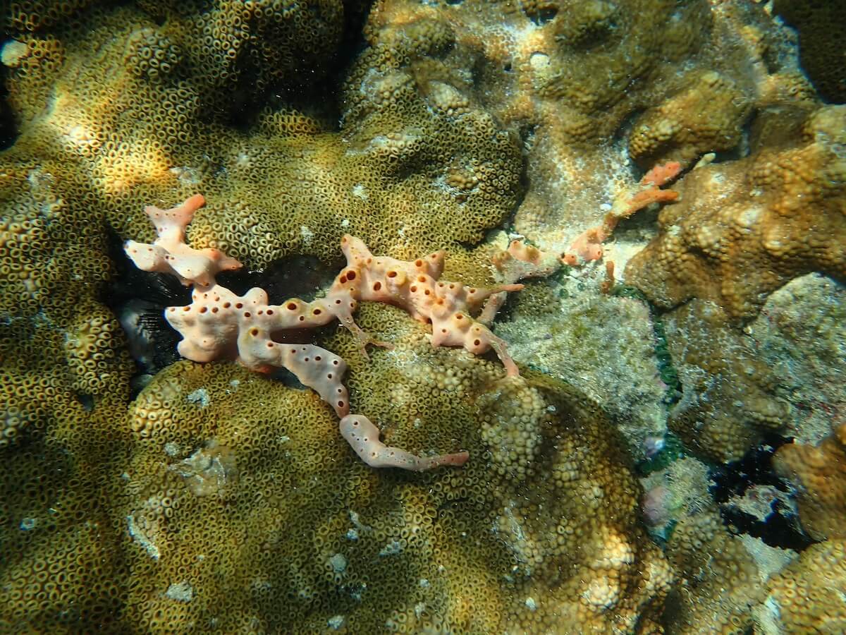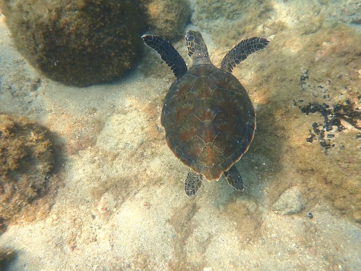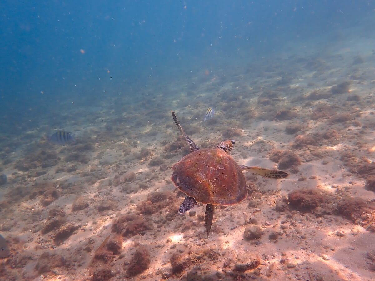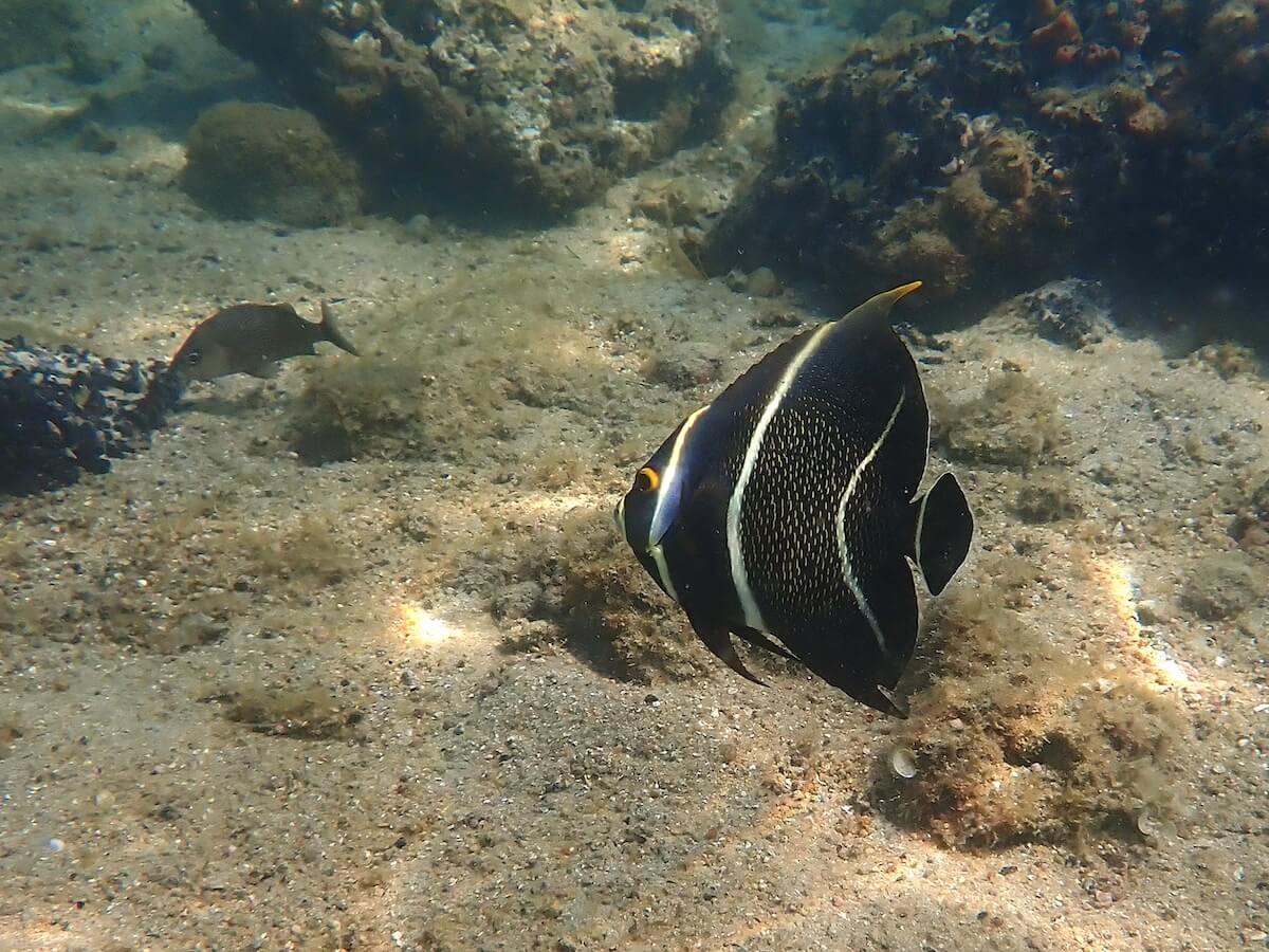 Si l’on voit beaucoup de poissons sur ce spot, et notamment des poissons-anges, des poissons-papillons, et des poissons-ballons, vous pourriez aussi y croiser des tortues vertes, plutôt communes autour de l’île. On rencontre en général de jeunes tortues pas très craintives, qui apprécient les eaux abritées des deux baies.
