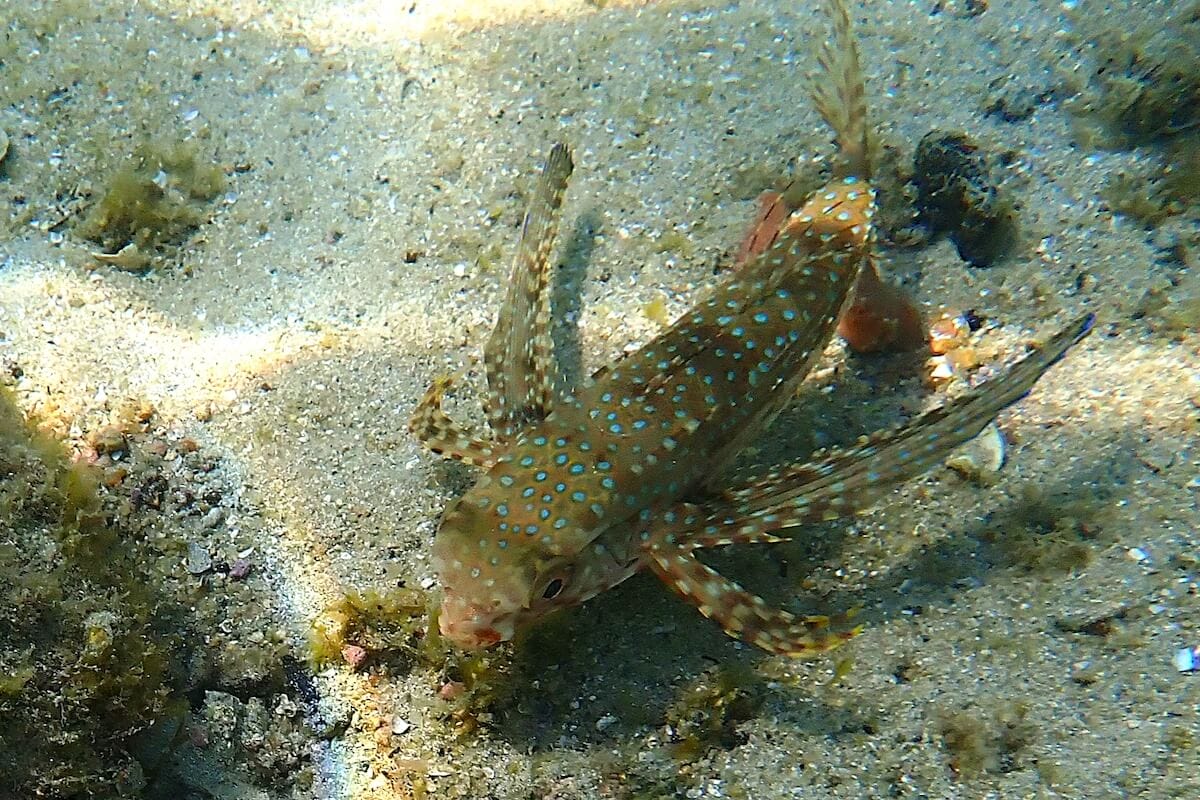 Dans le sable, vous pourrez parfois surprendre un grondin volant, qui déploie ses larges nageoires en forme d’ailes lorsqu’il se sent en danger.
