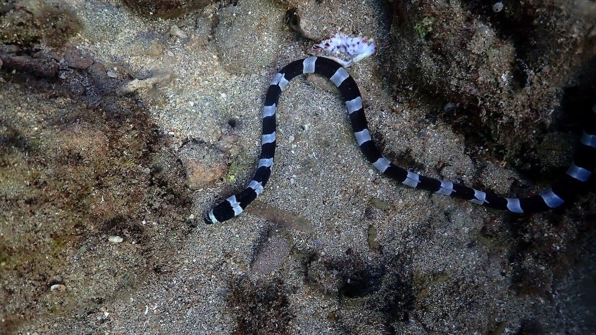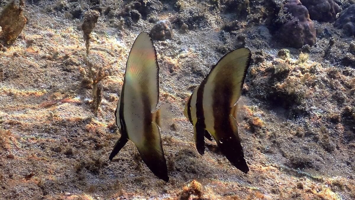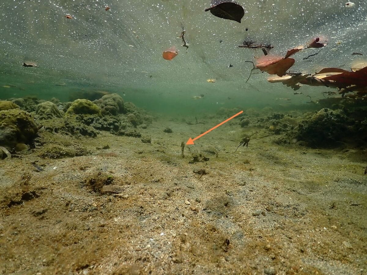 Entre la côte et le récif s’étend une zone peu profonde où l’on rencontre des fonds sableux, des éboulis rocheux et quelques racines (↕0,5-1,5 m). Ne négligez pas ce paysage sous-marin dépouillé: il abrite des espèces typiques du « muck snorkeling », comme les poissons-scorpions, les anguilles serpent, les crevettes pistolets, et surtout de magnifiques hippocampes.