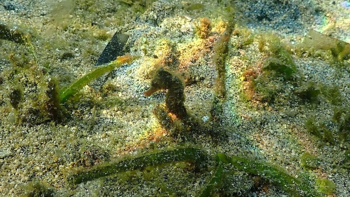 Ces derniers sont parfois présents sur le sable, accrochés à de petites plantes marines, à quelques mètres seulement du bord. Ces zones de sable sont aussi fréquemment visitées par des raies pastenagues masquées à points bleus.