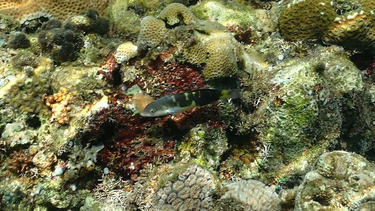 En palmant vers la mer, les fonds se couvrent peu à peu de coraux. Ceux-ci sont plutôt en mauvais état, et alternent entre massifs de coraux vivants et zones dégradées/débris de coraux (↕1-3 mètres).