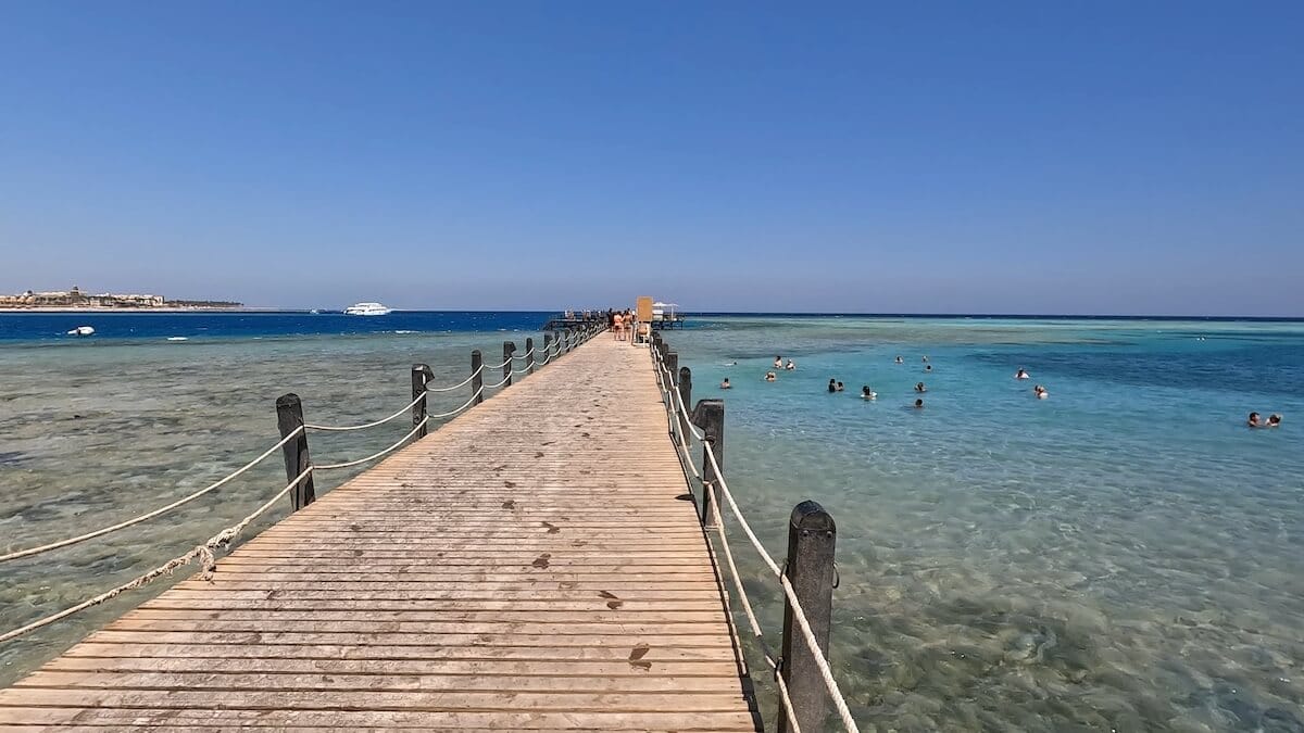 Le meilleur point d’entrée dans l’eau est le ponton du Stella Makadi Bay. Cette passerelle de 350 mètres de long donne accès à la fois aux petits lagons (entrée 2 sur la carte, sur la droite du ponton) et au tombant (entrée 1). Vous pouvez aussi vous mettre à l’eau depuis la plage du Labranda Makadi (entrée 3), mais vous devrez palmer sur plus de 200 mètres pour rejoindre les zones coralliennes les plus proches.