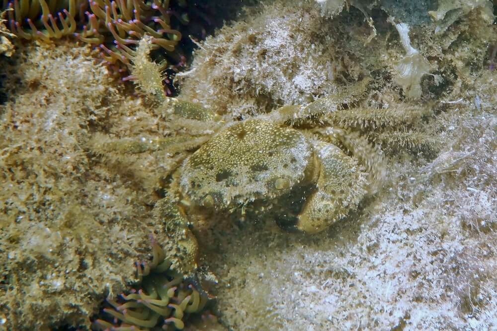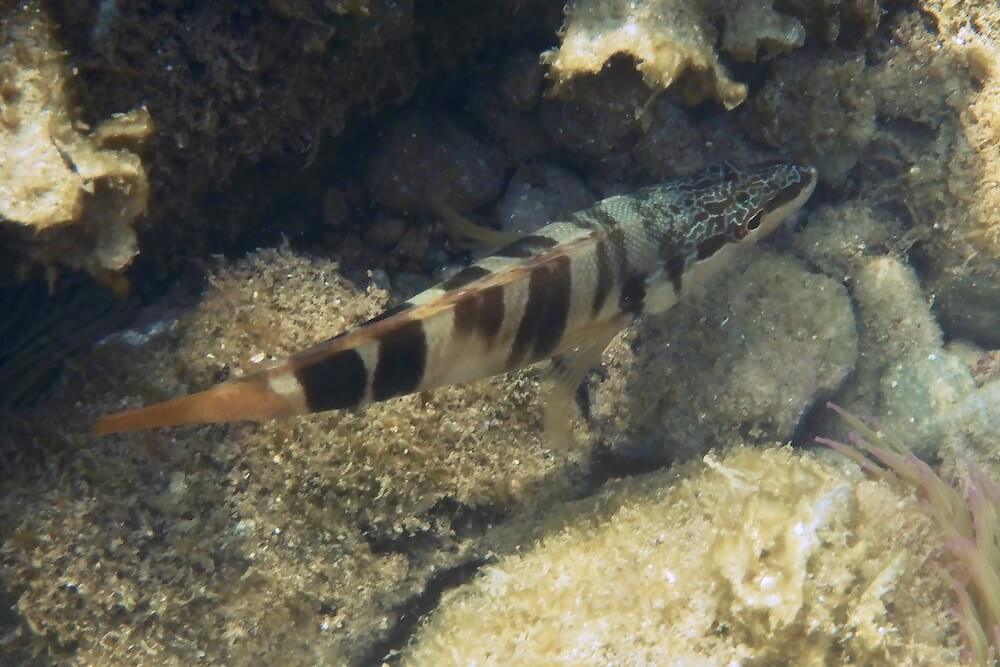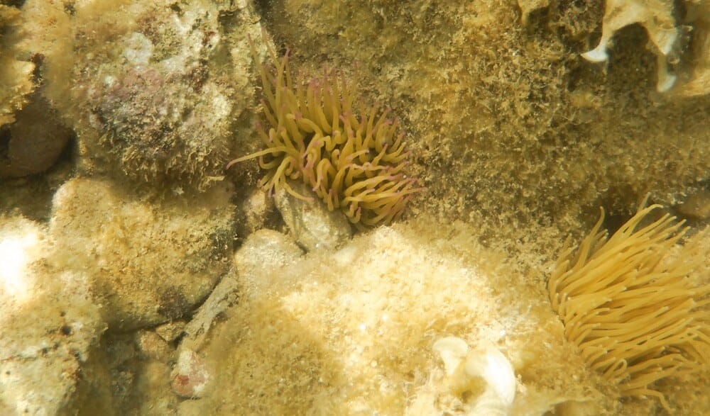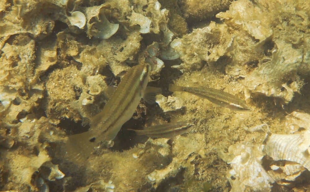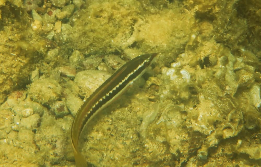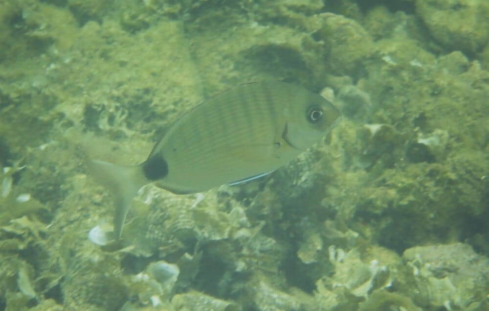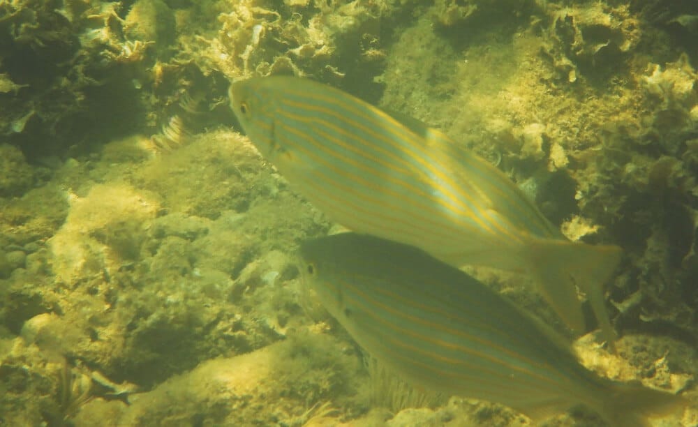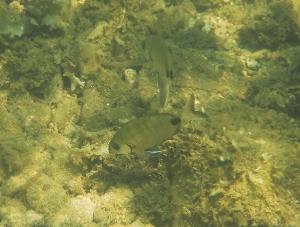 On voit les premiers poissons alors qu’il n’y a pas encore 50 cm de fond, tout près de la plage. Des oblades, des saupes et de nombreux crénilabres-paon nagent au-dessus des galets, entre lesquels sont fixées de petites anémones de mer.