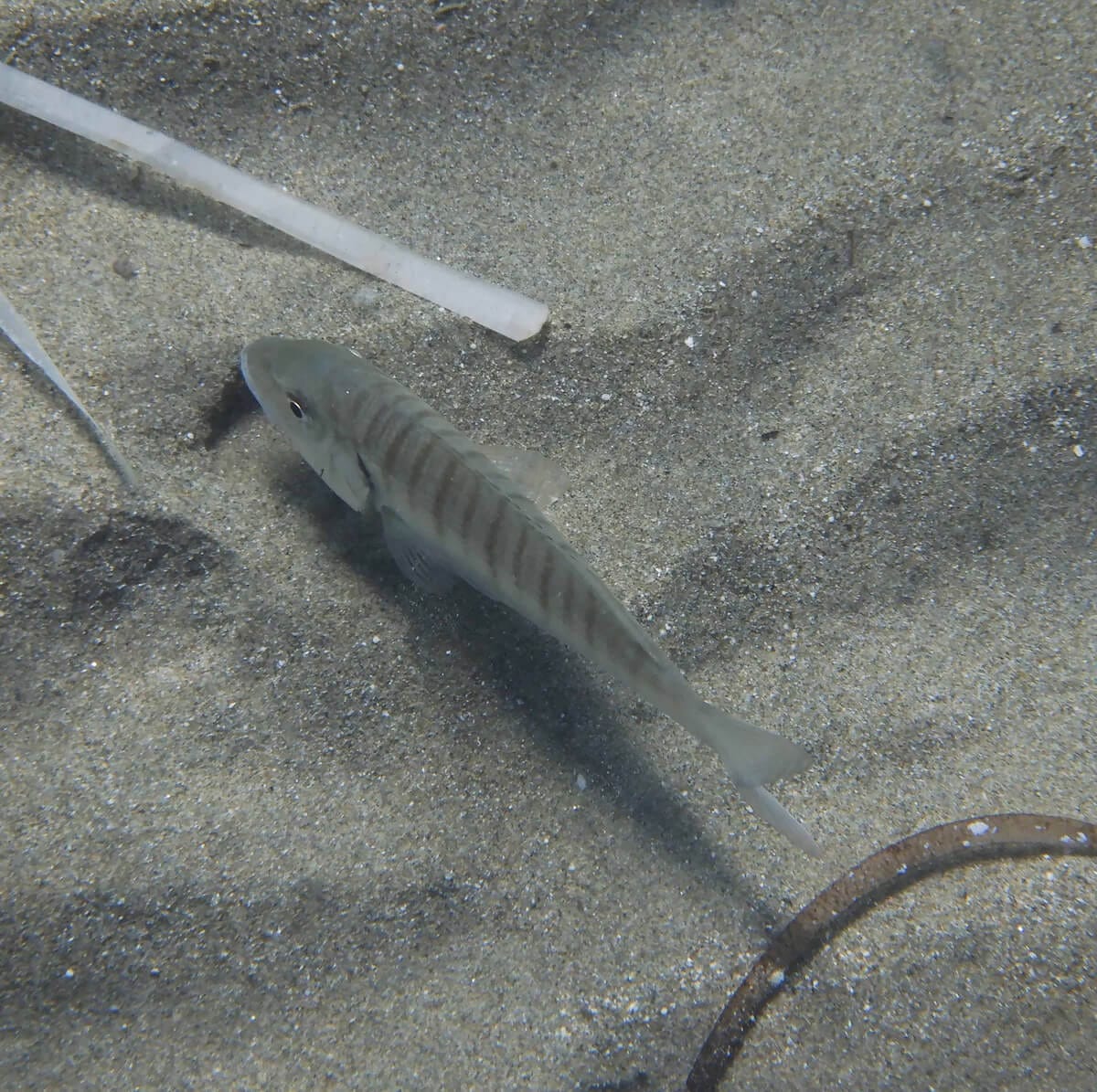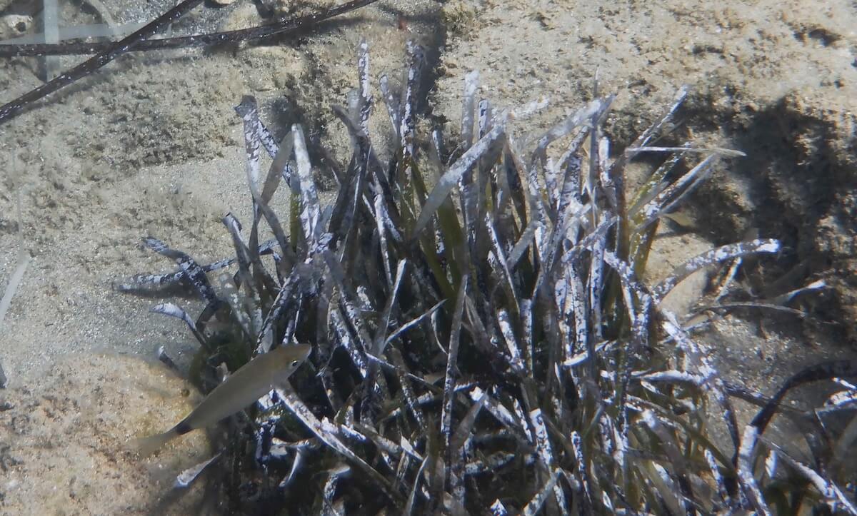 Les rochers de la côte se prolongent sous l’eau, formant un petit tombant et des reliefs sous-marins variés (↕1-2m). En plusieurs endroits, on rencontre de beaux herbiers de posidonie régulièrement implantés au milieu de zones sableuses.