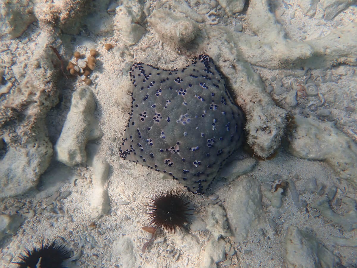 En dépit de cet environnement au premier abord peu attrayant, ce spot est très intéressant en raison des nombreux poissons et invertébrés que l’on rencontre sur les petits fonds. Le sable et les herbiers sont habités par une grande variété d’échinodermes, et notamment des étoiles de mer à bosses rouges, des étoiles de mer coussin, des oursins bonnet de prêtre et des oursins perforants. Des bénitiers et d’autres bivalves non identifiés sont fixés sur les roches coralliennes, qu’ils partagent avec des éponges.