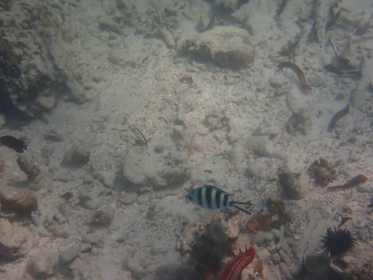 Le platier corallien qui fait face au Nomad Beach mesure près d’un kilomètre de large. On vous conseille de ne pas aller plus loin que 300 mètres de la plage, et d’emmener avec vous une bouée de plongée pour vous rendre plus visible auprès des jet skis qui traversent parfois le lagon.