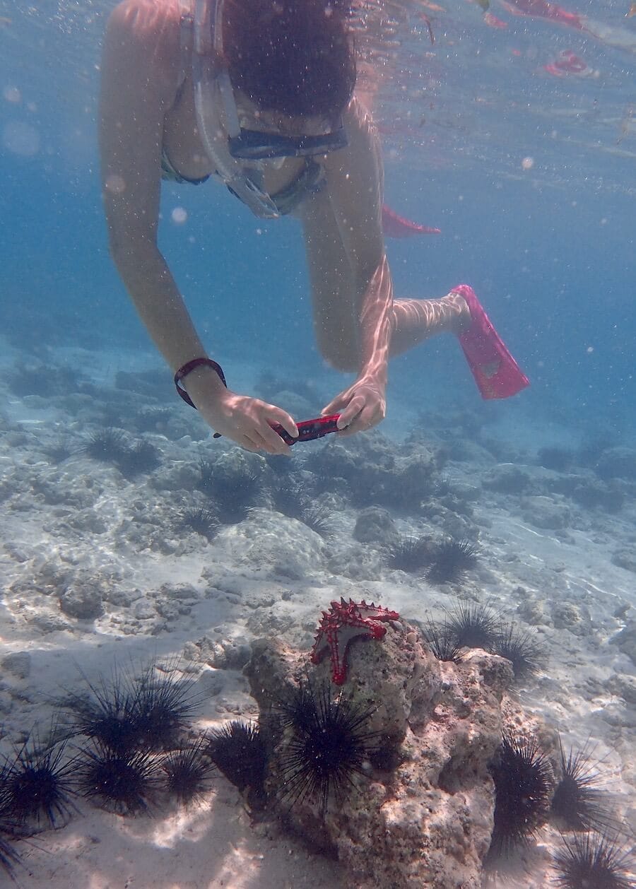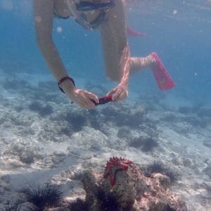 Mettez-vous à l’eau directement depuis la plage, en faisant attention aux nombreux oursins (pas toujours visibles, comme le redoutable oursin-fleur) présents à faible profondeur.