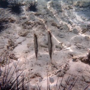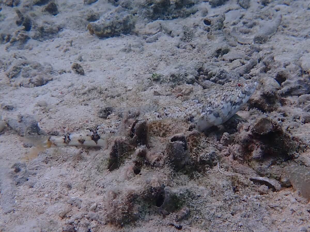 A environ 100m du bord, les fonds se creusent et la pente sableuse glisse dans le bleu. Quelques patates et pinacles, foisonnants de vie, émergent par endroits (↕3-5m) mais nécessitent un peu d’apnée pour être vraiment explorés.