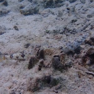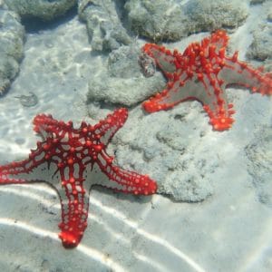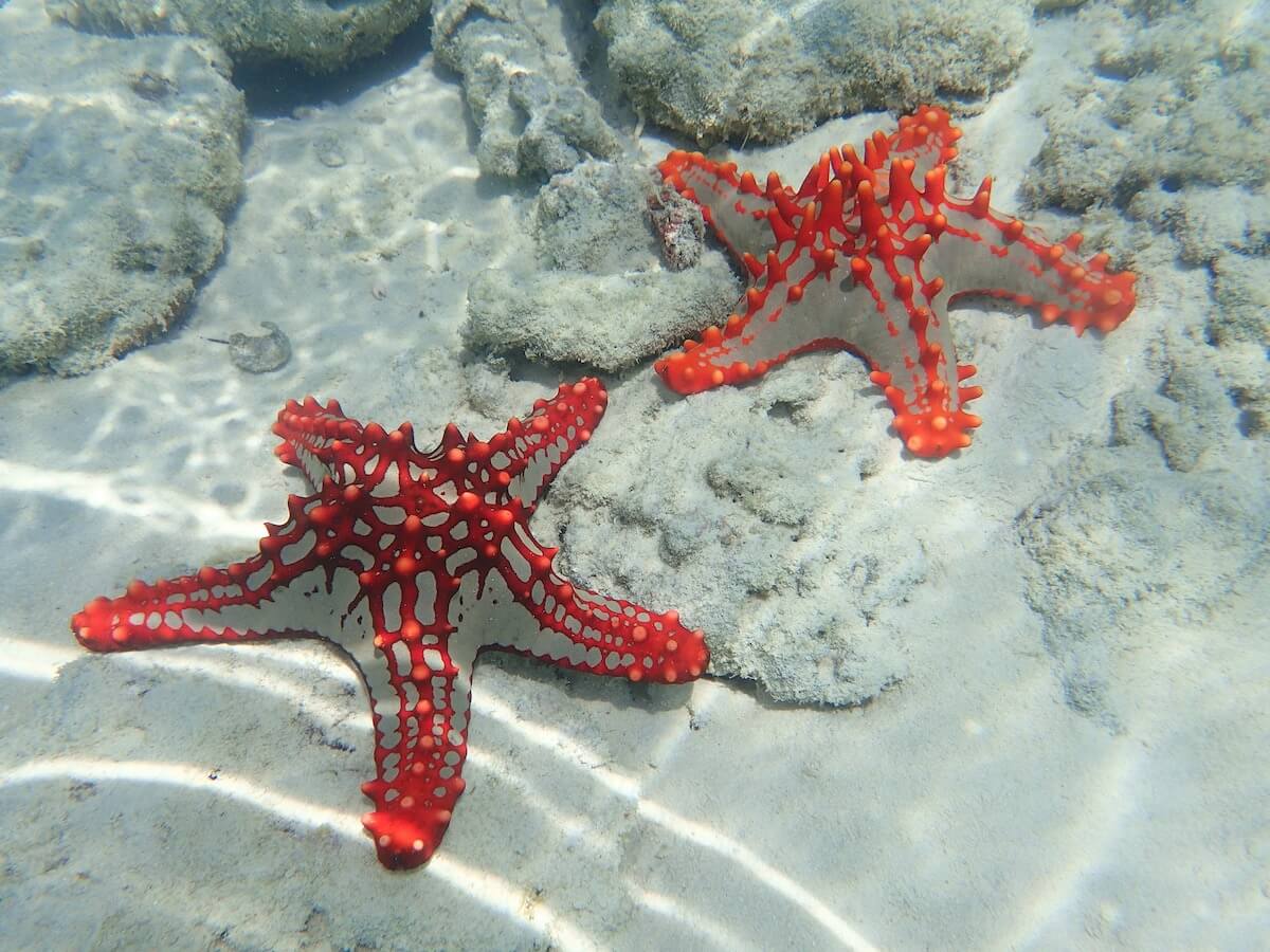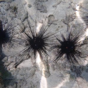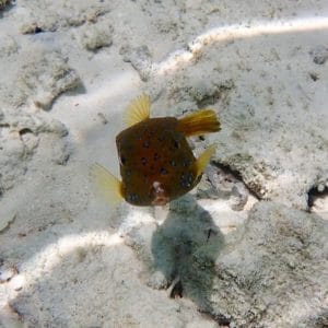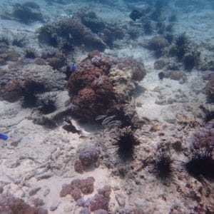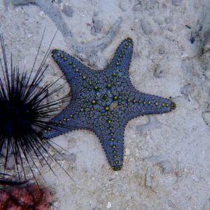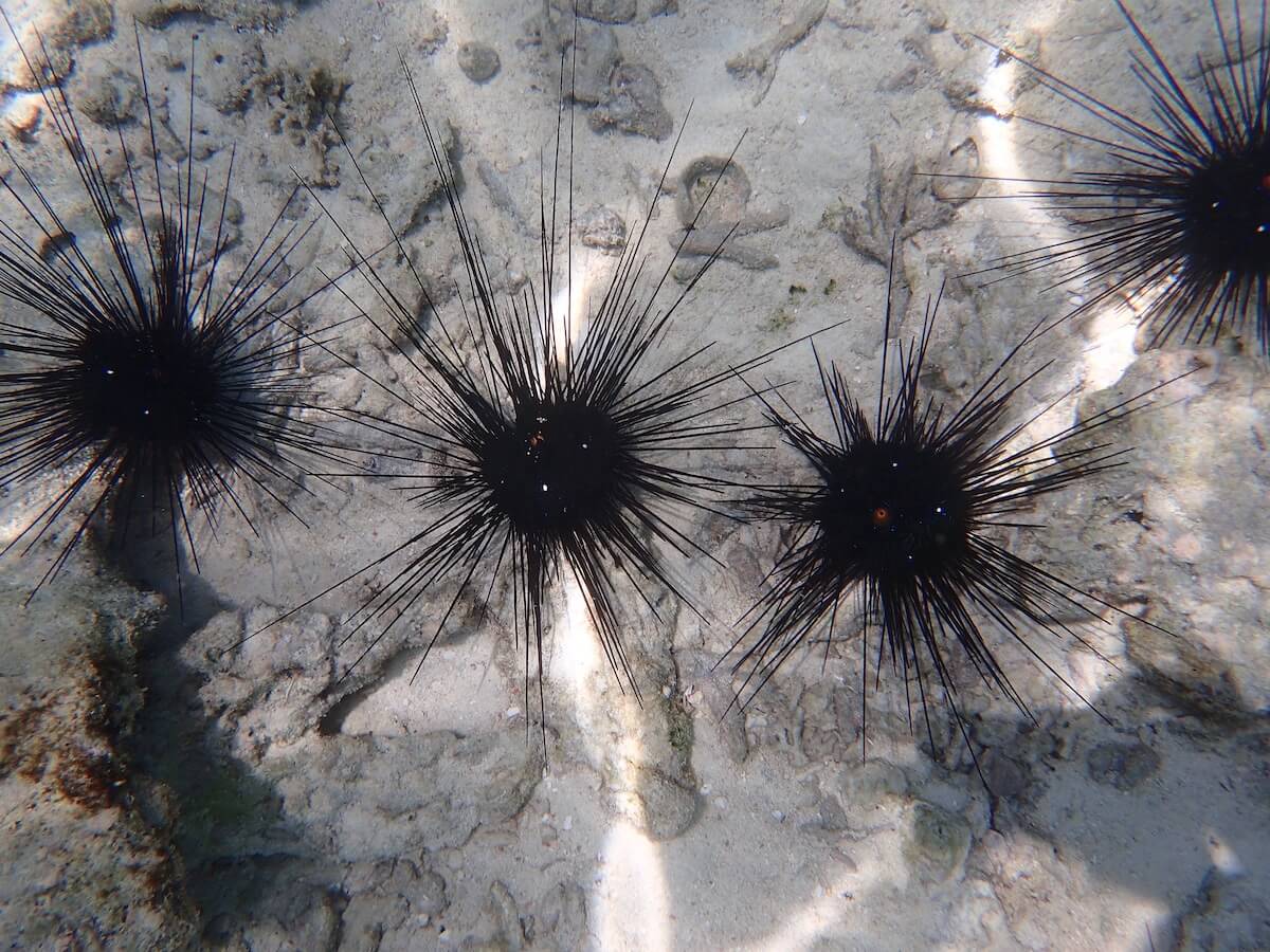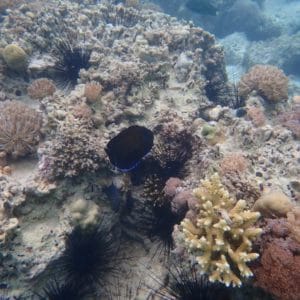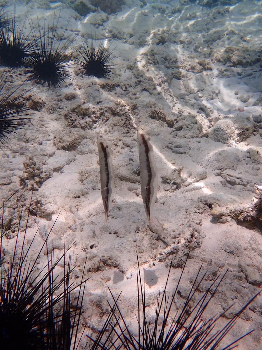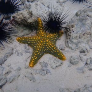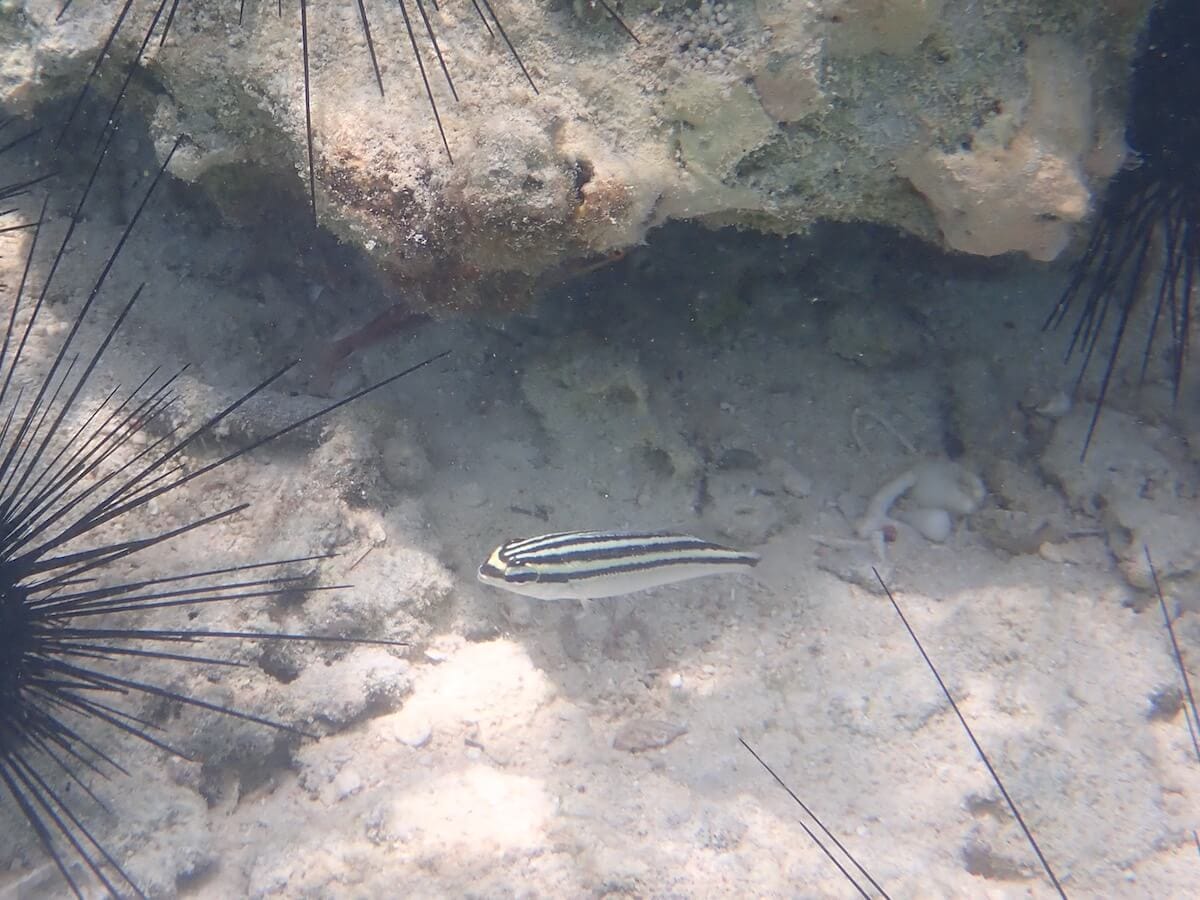 Vous apercevez rapidement de petits champs d’oursins diadème dans lesquels se cachent de minuscules dascylus à trois points, ainsi que de nombreuses étoiles de mer à bosses rouges (↕0,5-1m). Des canthigaster à selles, des poissons-coffres jaunes et (plus rares) poissons-vache diaphane vont et viennent entre les rochers.