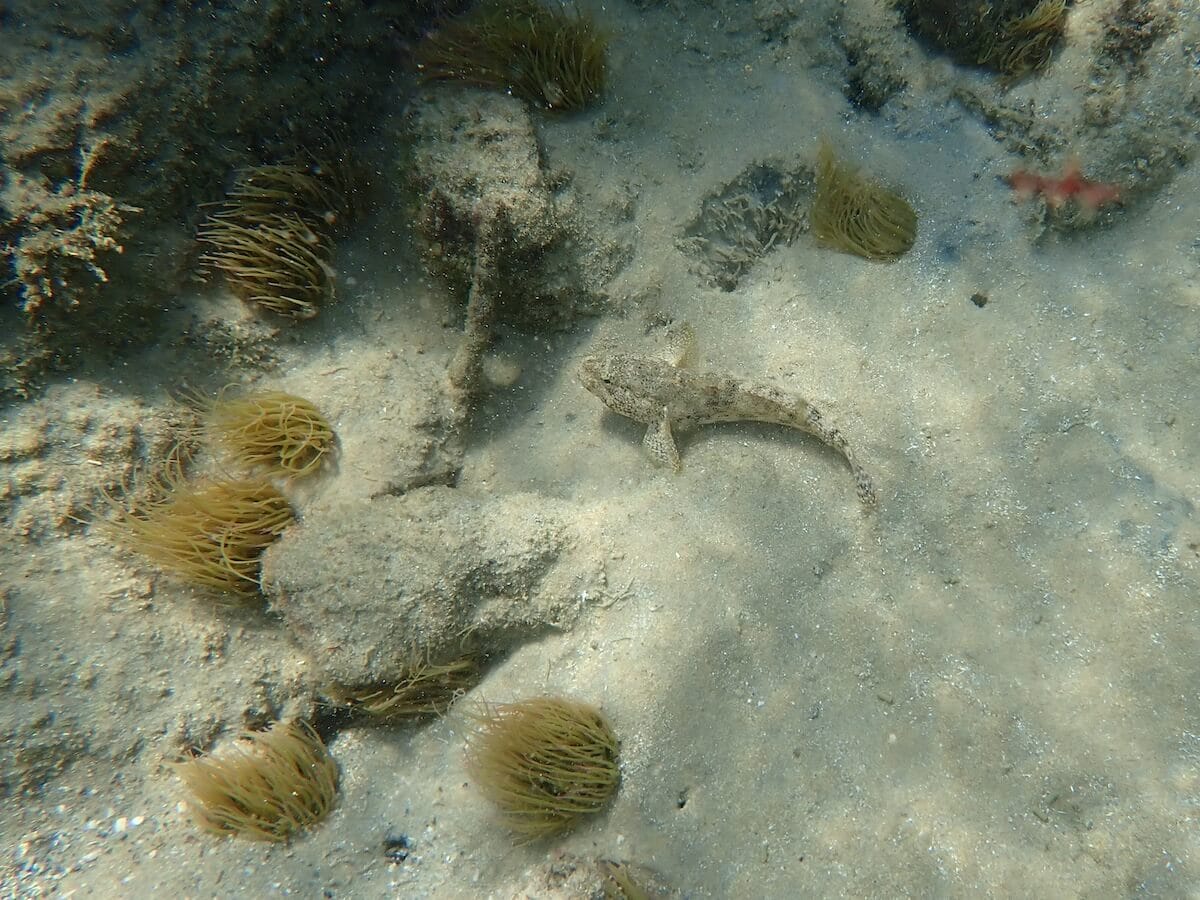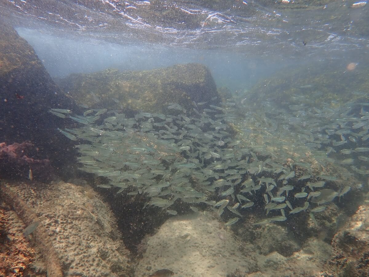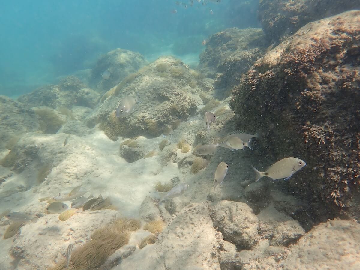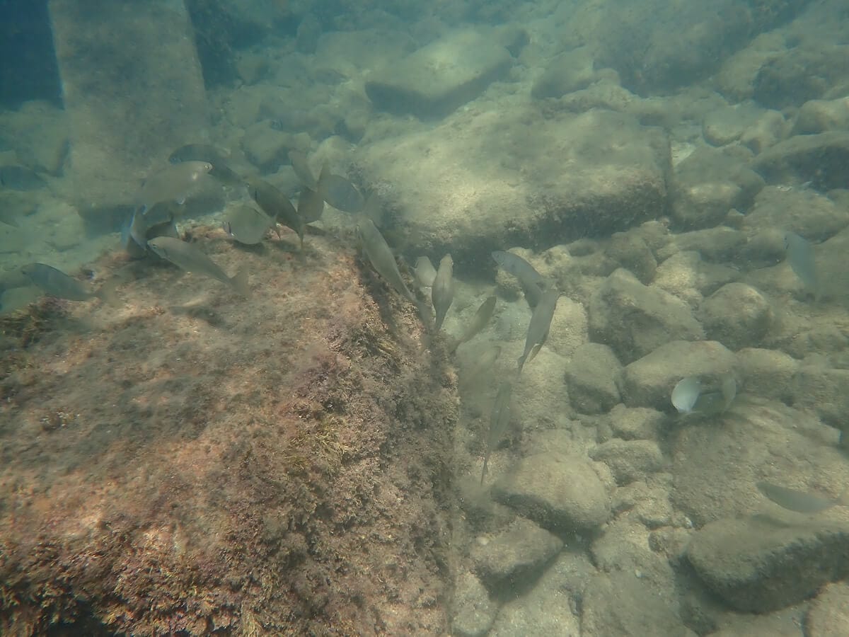 La partie la plus poissonneuse se trouve le long de l’ancien quai, où des dizaines de sars communs, de poissons lapins et de rougets de Mer Rouge (les deux derniers étant des espèces exotiques invasives) nagent au dessus des rochers.