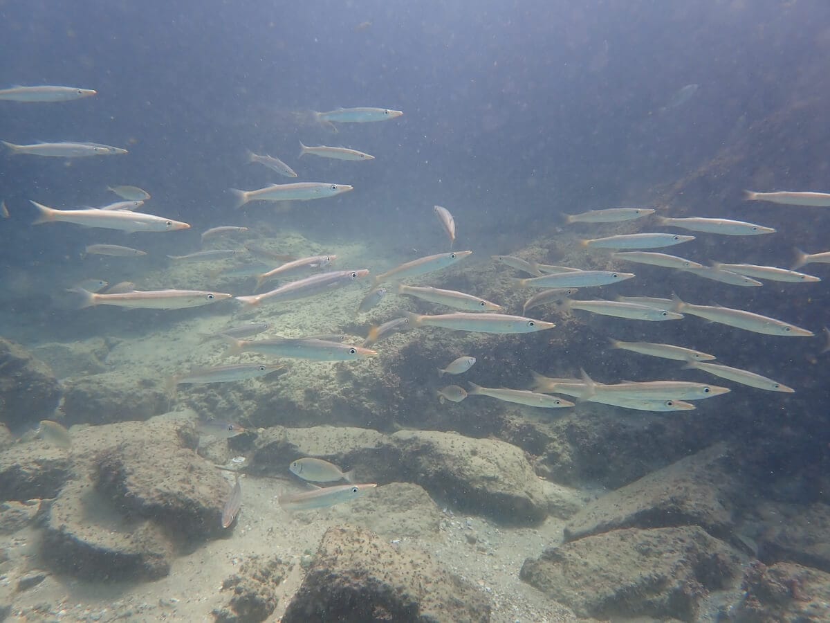 Des grands bancs d’anchois ou de barracudas à bandes jaunes sont souvent présents le long de la digue du port.