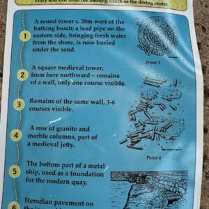 Des vestiges archéologiques datant de l’époque romaine sont disséminés un peu partout dans l’ancien port. Les plus faciles à voir sont les restes de colonnes, présentes à plusieurs endroits, y compris à faible profondeur.