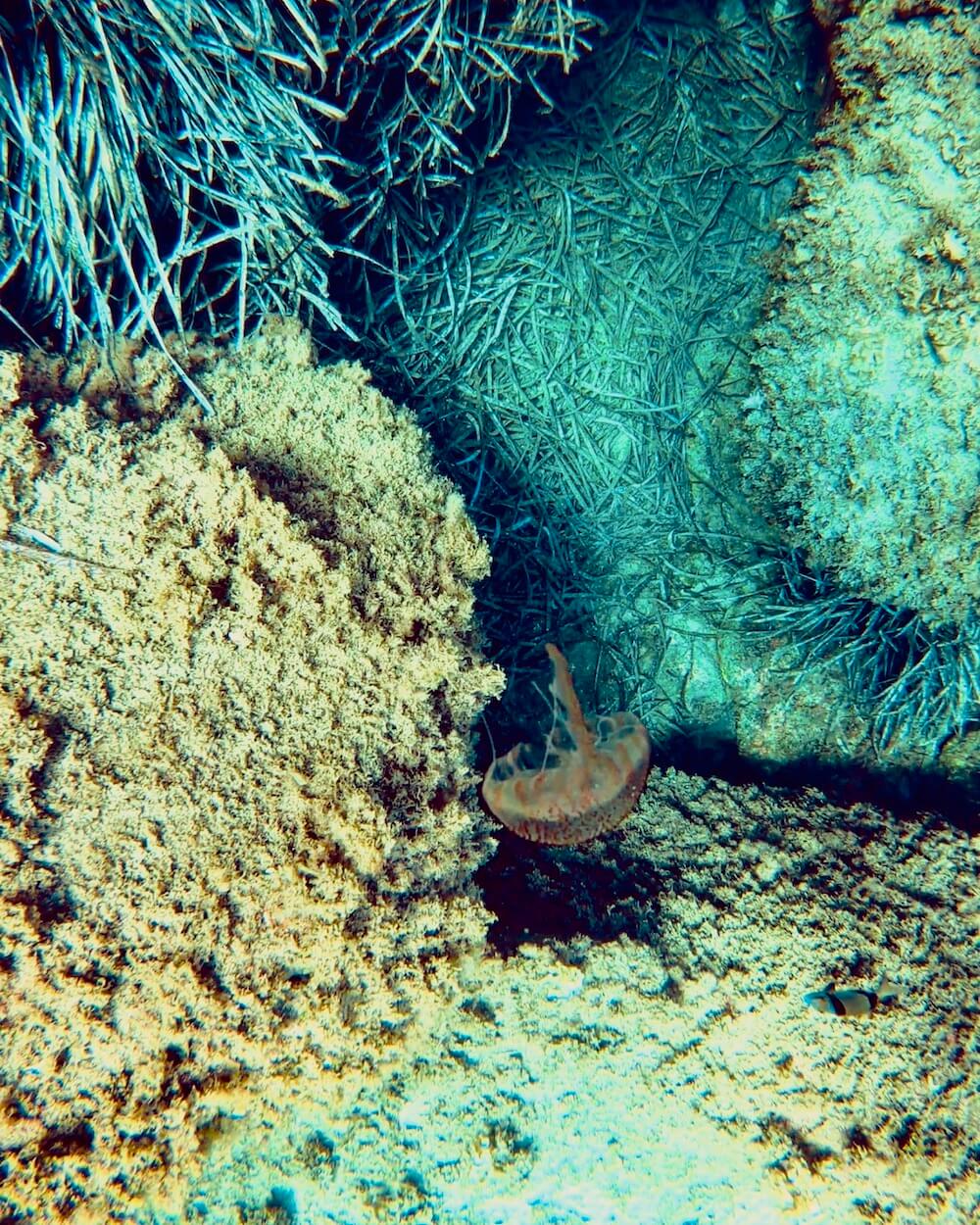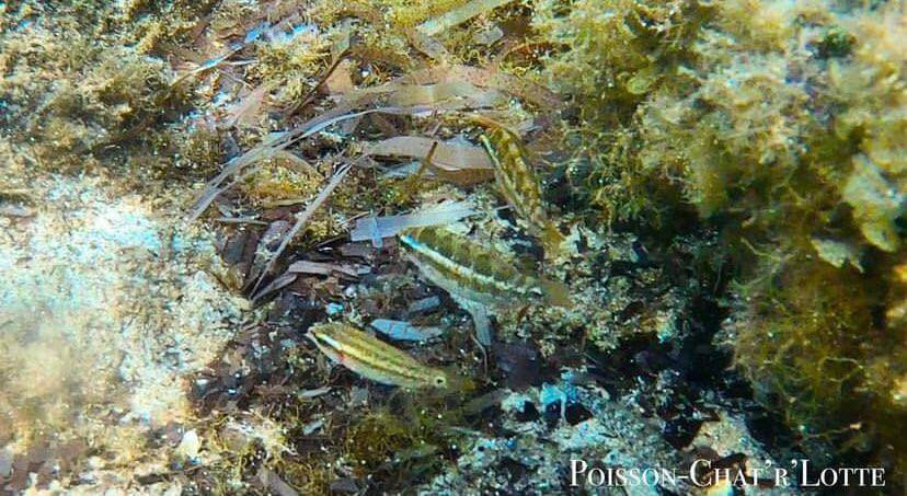 Sur les fonds, on rencontre d’abord une jolie diversité d’invertébrés: des anémones de mer, des concombres de mer (ou holothuries), des éponges noires, mais aussi quelques seiches camouflées sur le sable. N’hésitez pas à entrer dans les trouées dans les massifs de posidonie, pour y découvrir de beaux oursins.
