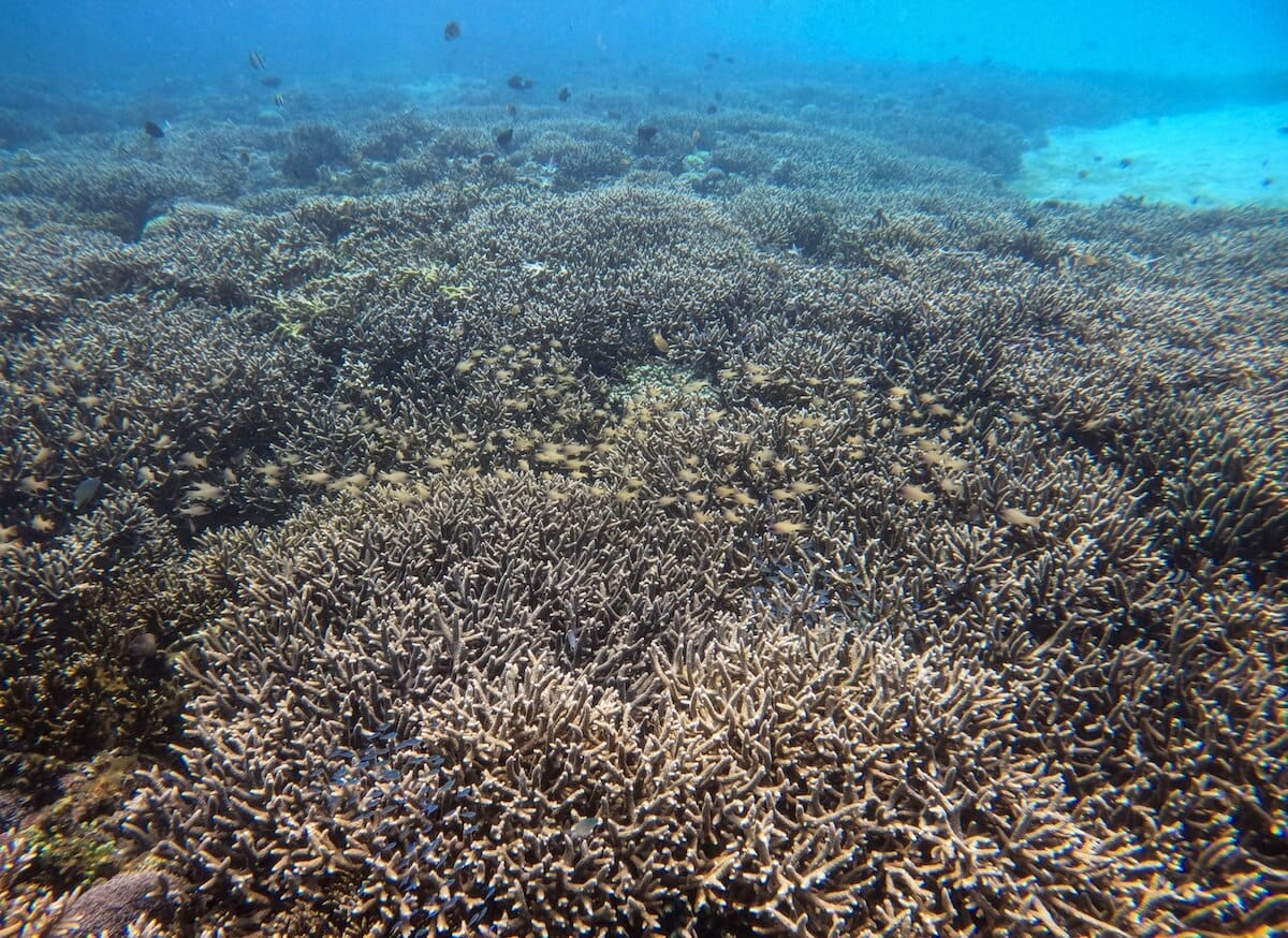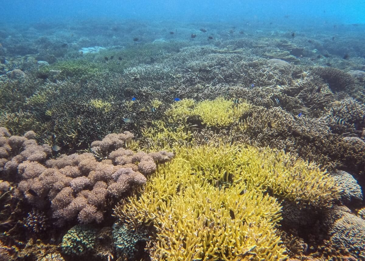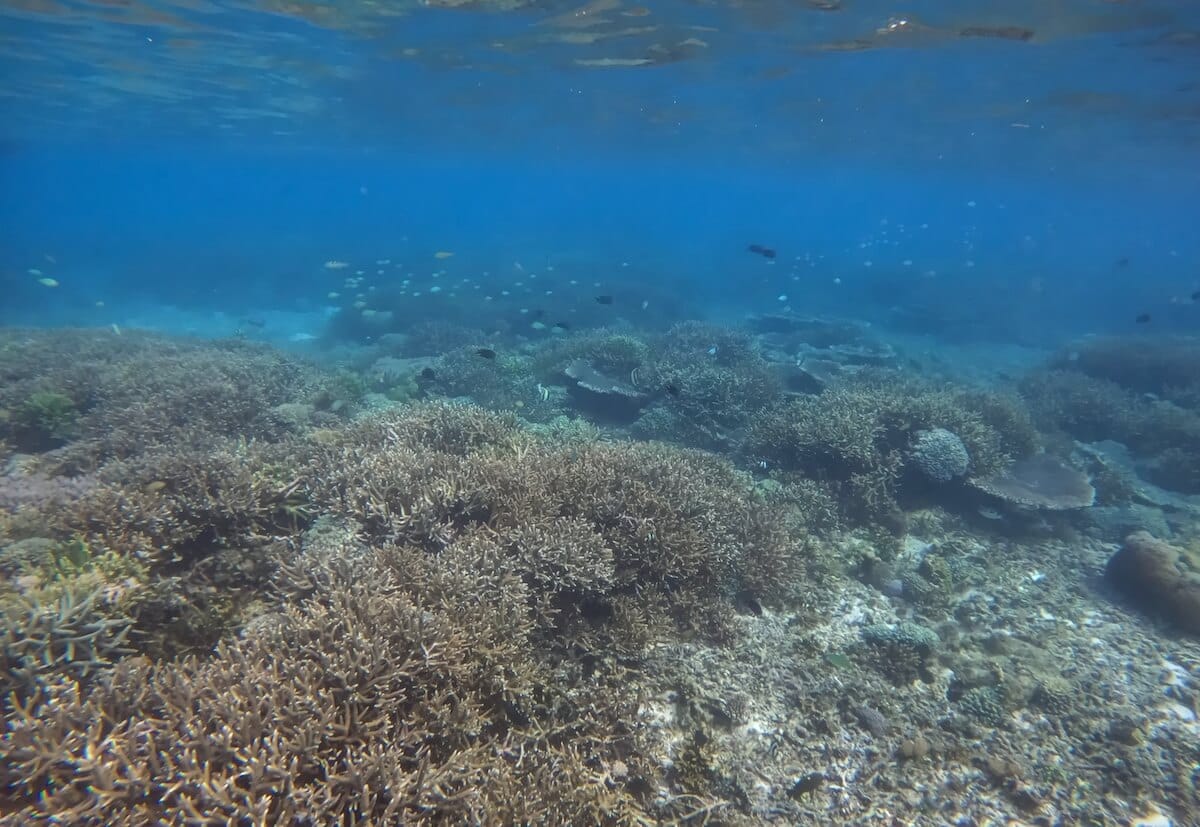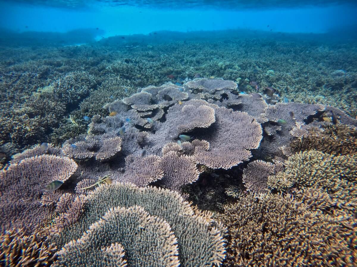 Bien que les fonds marins soient encore bien recouverts de coraux durs (principalement des coraux branchus et des coraux tabulaires), certains d’entre eux sont déjà blanchis et sont morts (couleurs blanches) ou sont en mauvais état (vert et bleu extrêmement brillants).