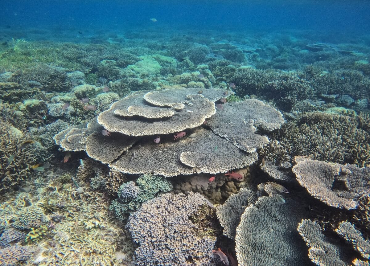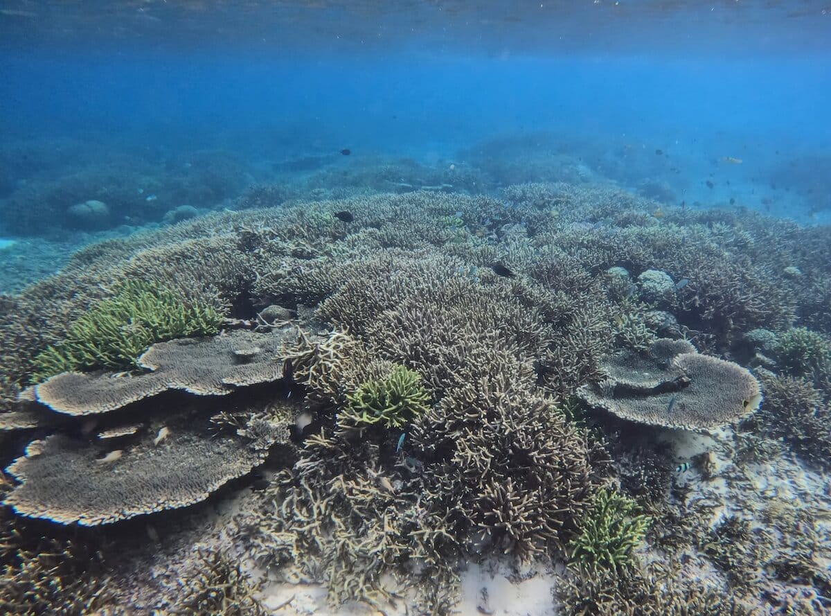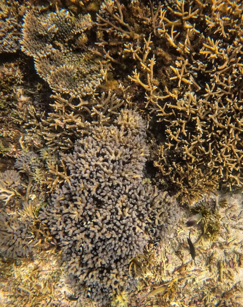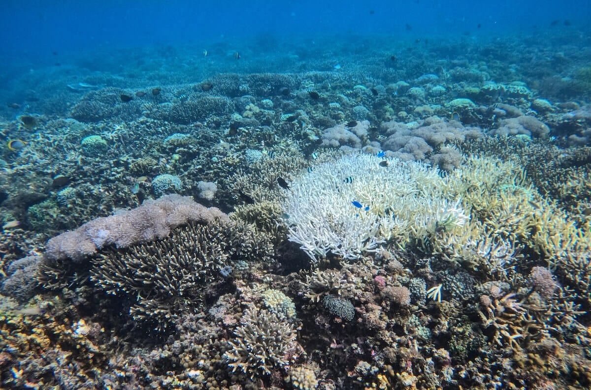 Bien que les fonds marins soient encore bien recouverts de coraux durs (principalement des coraux branchus et des coraux tabulaires), certains d’entre eux sont déjà blanchis et sont morts (couleurs blanches) ou sont en mauvais état (vert et bleu extrêmement brillants).